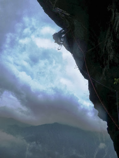 1箇所壁を乗り移る場面でピンが遠い。前方のクラックにエイリアンを効かせ、恐るおそる体を引き寄せて前進する。ハングを乗り越えた左上の終了点を目指すと、最後の1手がまた遠い。が、草陰に隠れたピトンを探し出してひと安心。