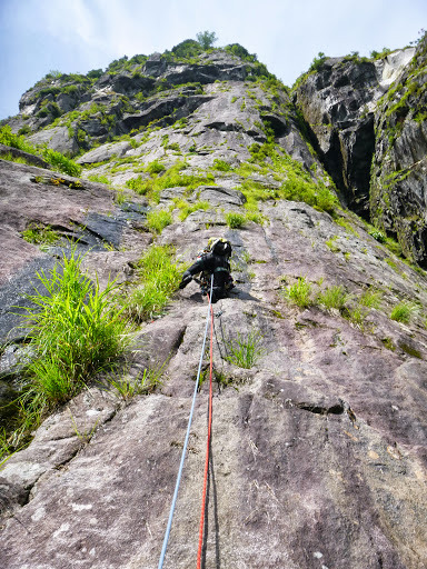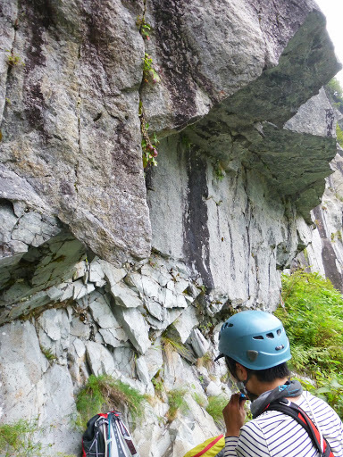 ■2P目:35m IV-A1 S原 ほぼ直上するラインを人工で登る。時々ボルトの遠い箇所もあるが、よく探すと草むらにピトンが隠れていたりする。ハング下の小テラスでビレイ。