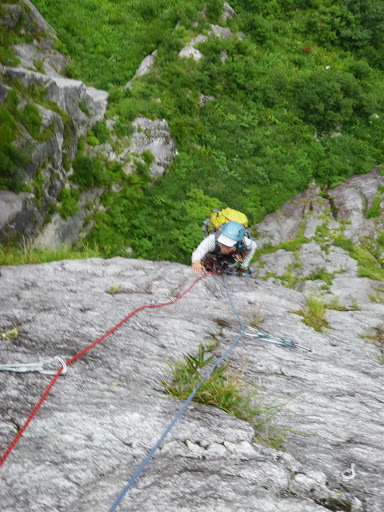 ピンが比較的近く、垂直までは易しい箇所も多く、むしろ三つ峠での練習の方が難しいくらいに感じました。大ハングはやはり難しく、私がリードしていたらきっとビバークになるところでした。懸垂を始めてからみるみるうちに暗くなり、雷が鳴り出し、雨が降り出し、降り過ぎて下降点がなくなった瞬間は、負のスパイラル過ぎて死ぬかと思いました。初めての暗闇懸垂で、終始心臓が飛び出しそうでした。そんな中、冷静に導いてくださったリーダーには、本当に感謝です。どうもありがとうございました。