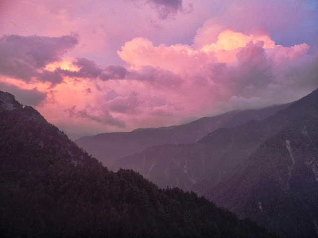 空中懸垂1回で中央バンドに着き、バンド右端に戻って登攀ルートを逆に辿る。一旦は空が夕焼けに染まり、明日までの好天を期待させたが、日が暮れるとともに雷が鳴りだして、にわか雨がぱらついた。