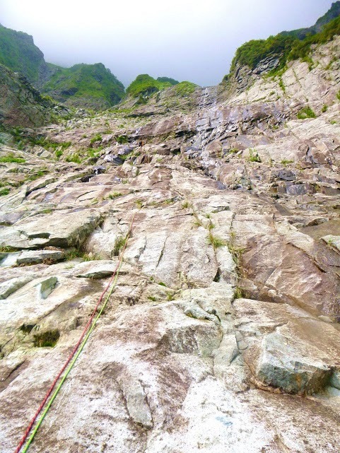 4ピッチほどスタカットで登っていると雨が降り出す。長い時間ビレイしていると寒いし暇だしで、少し傾斜も緩んだので、ここからは、ザイルを解いて各自・自己責任で登ることにする。
