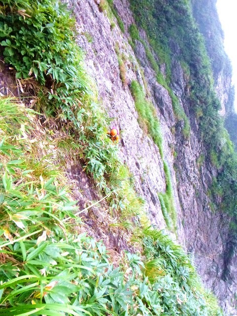 これで、大滝登攀はとりあえず終了。しかし、傾斜はまだまだある。時間も押しているので、尾根を辿って稜線に出ましょ、ということにする。隣の中央ルンゼの洞穴ハングがかなり高い位置に見える。ということは、まだまだかなり低いところにいるけど、暗くなっても肩ノ小屋くらいには着けるでしょ、水も途中、沢に降りれば汲めるでしょ、というゆーことで、間違って落ちたら空を飛ぶくらいに急な笹尾根(滑る!)をスタカットで漕ぐ。