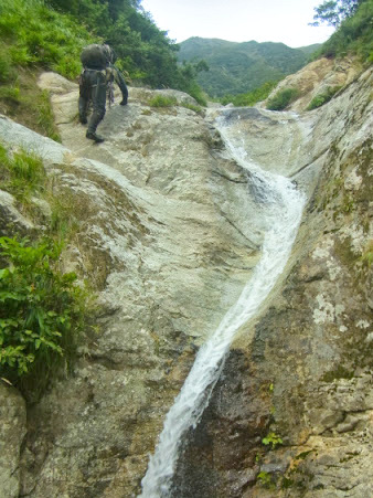 そして核心部と予想していた大滝が現れた。「奥利根の山と谷」のトポでは40mとなっているが、実際は2段30mと思われる。左岸のバンドを利用して巻く。バンドに乗るまでが泥壁でいやらしい。