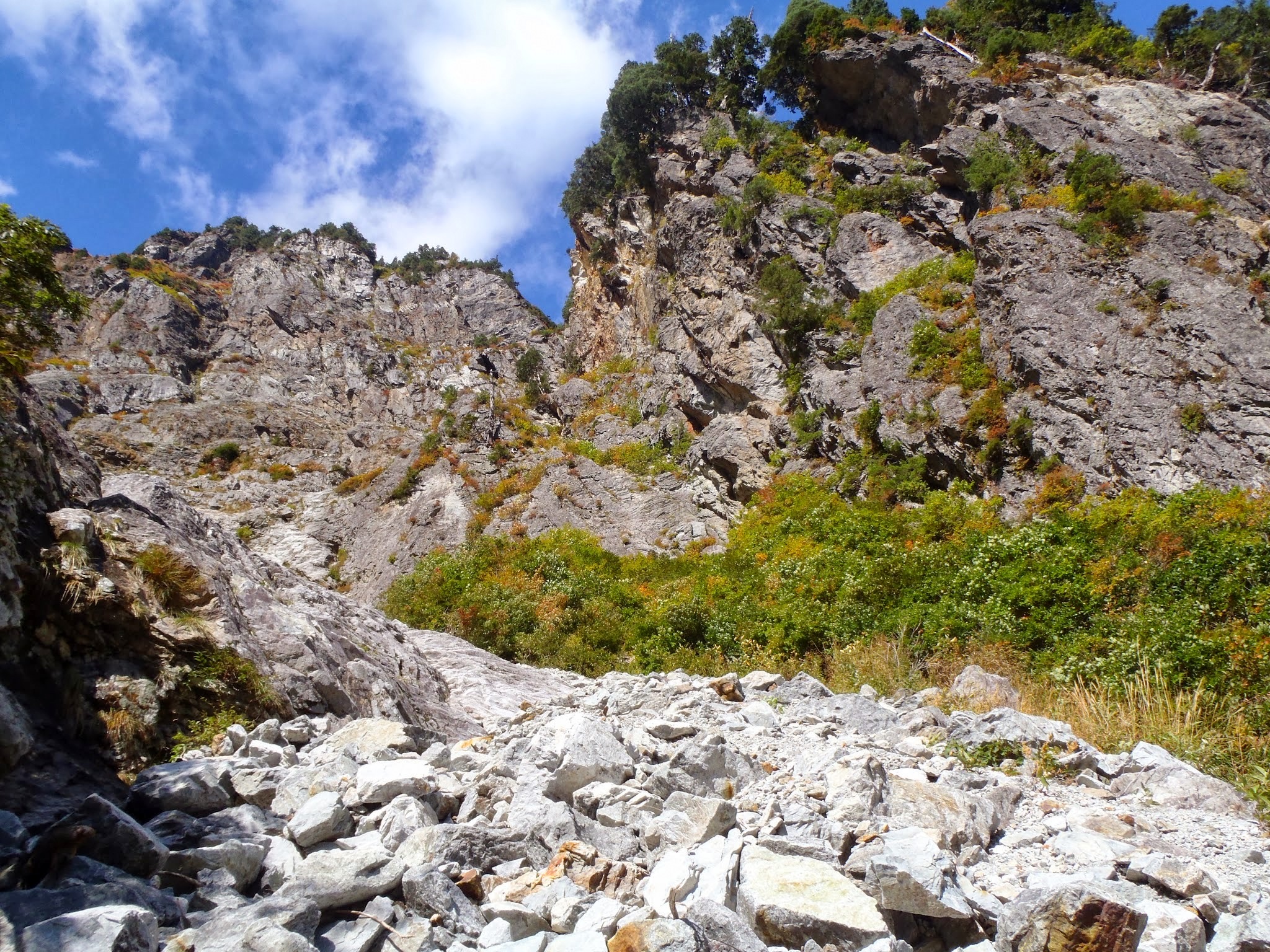 最初は巨岩やらゴーロやら、のち右手の2尾根の壁が近づいてくると快適なスラブとなるもあっという間に終了。藪漕きとなる。二俣を藪トラバースで左上、傾斜がこの辺で落ち一息。しかし岩が脆い。