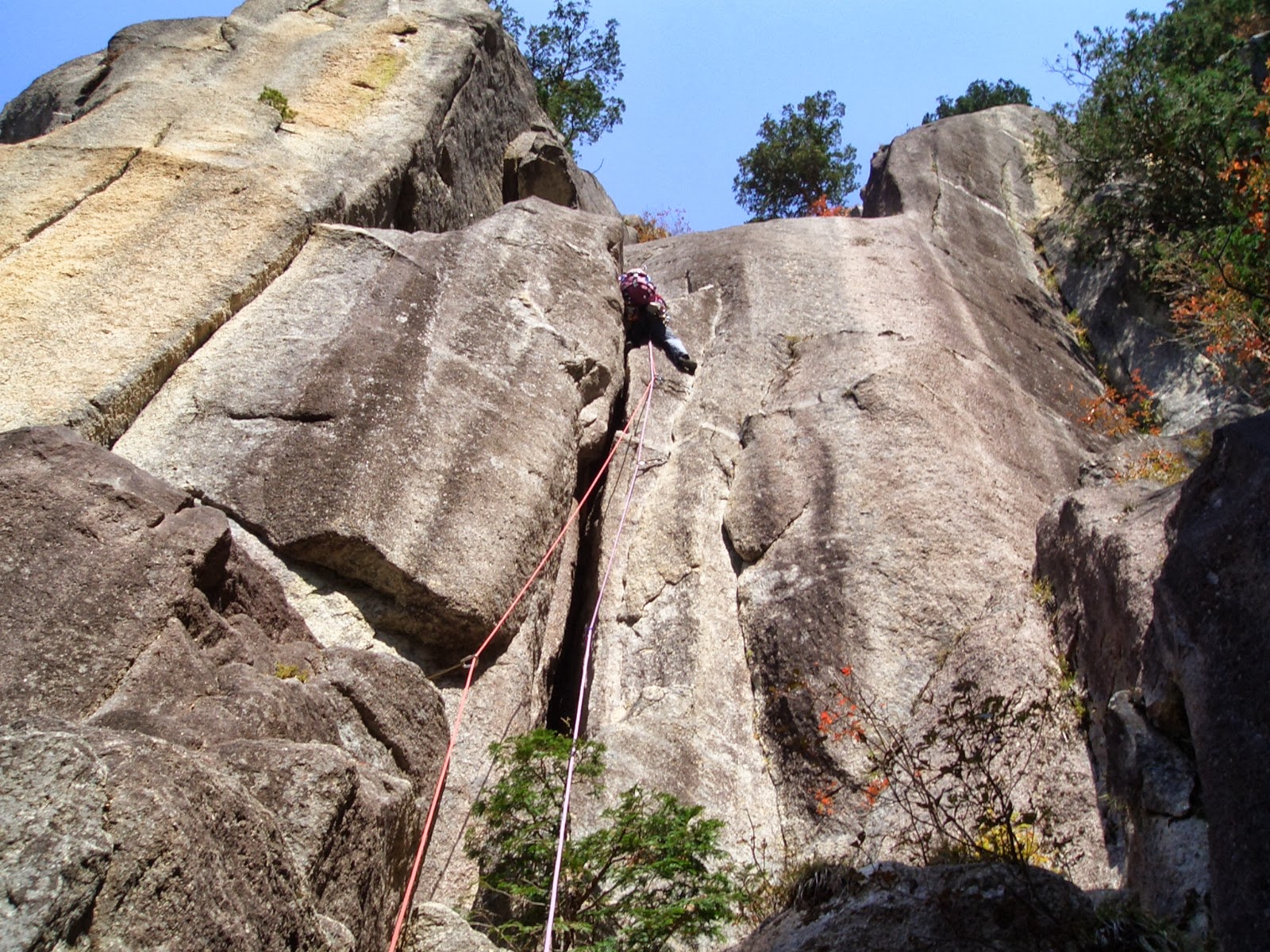 木登りから、スラブへ乗り移って右トラバース後は、ポケット、フレークを繋いで直上。プロテクションが取れず結構ランナウトするので、怖いと思う気持ちに打ち勝つことがポイントだった。