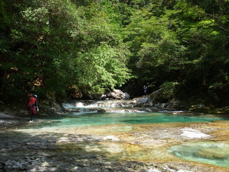 まずは「ふじんぼ滝」を左岸から巻いて第1ゴルジュを抜けると、明るい渓相となる。淵を泳ぎながら進んでいると気分はさながら盛夏。