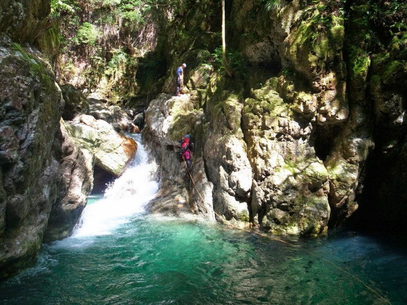 この付近はウォーターアクティビティが盛んな様で、ラフティングやキャニオニングを楽しむ人々もちらほら。橋の脇で準備後、遊歩道から下降して、沢床へ降り立つ。
