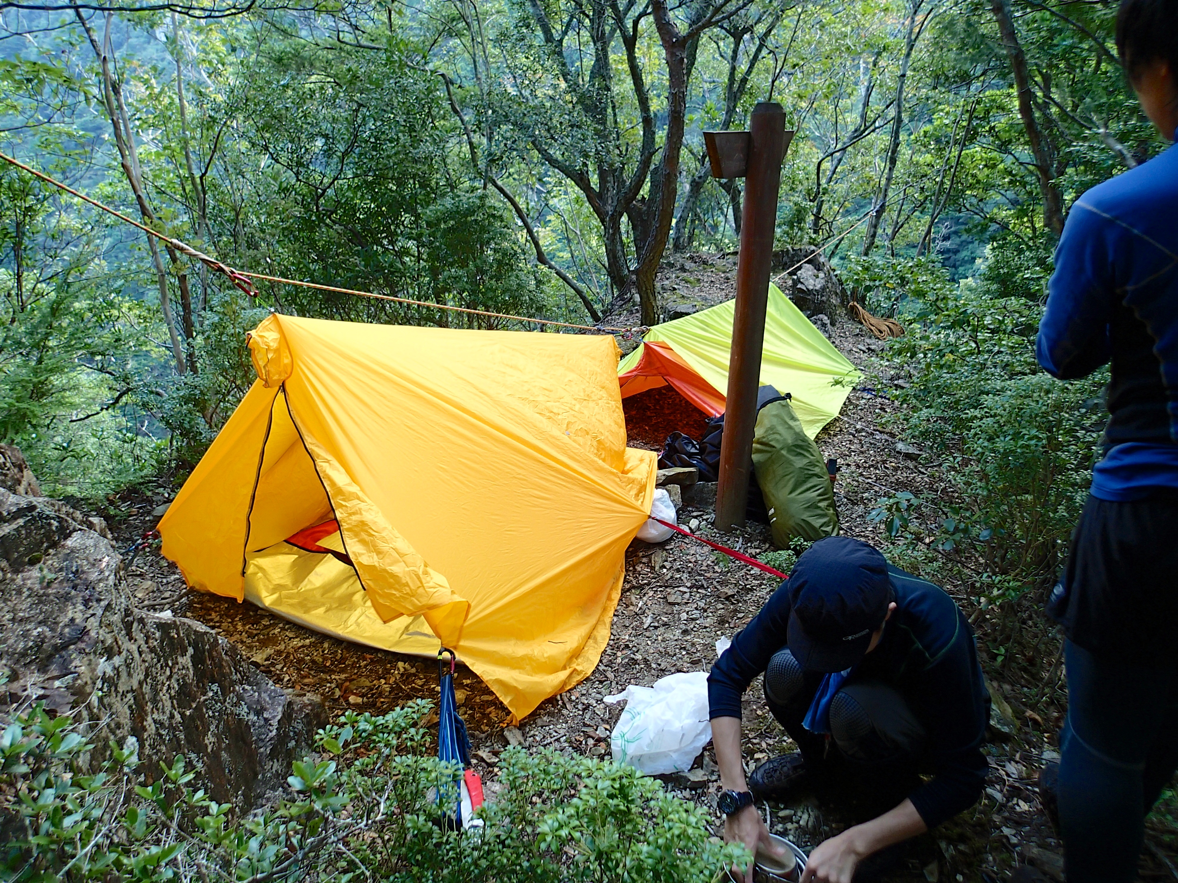 最初は茂みの中にツェルトを張っていたが、寝る直前にヤマビルがいることが判明したので、河原方面に再設営。この夜は無事、虫の被害から免れた様だ。