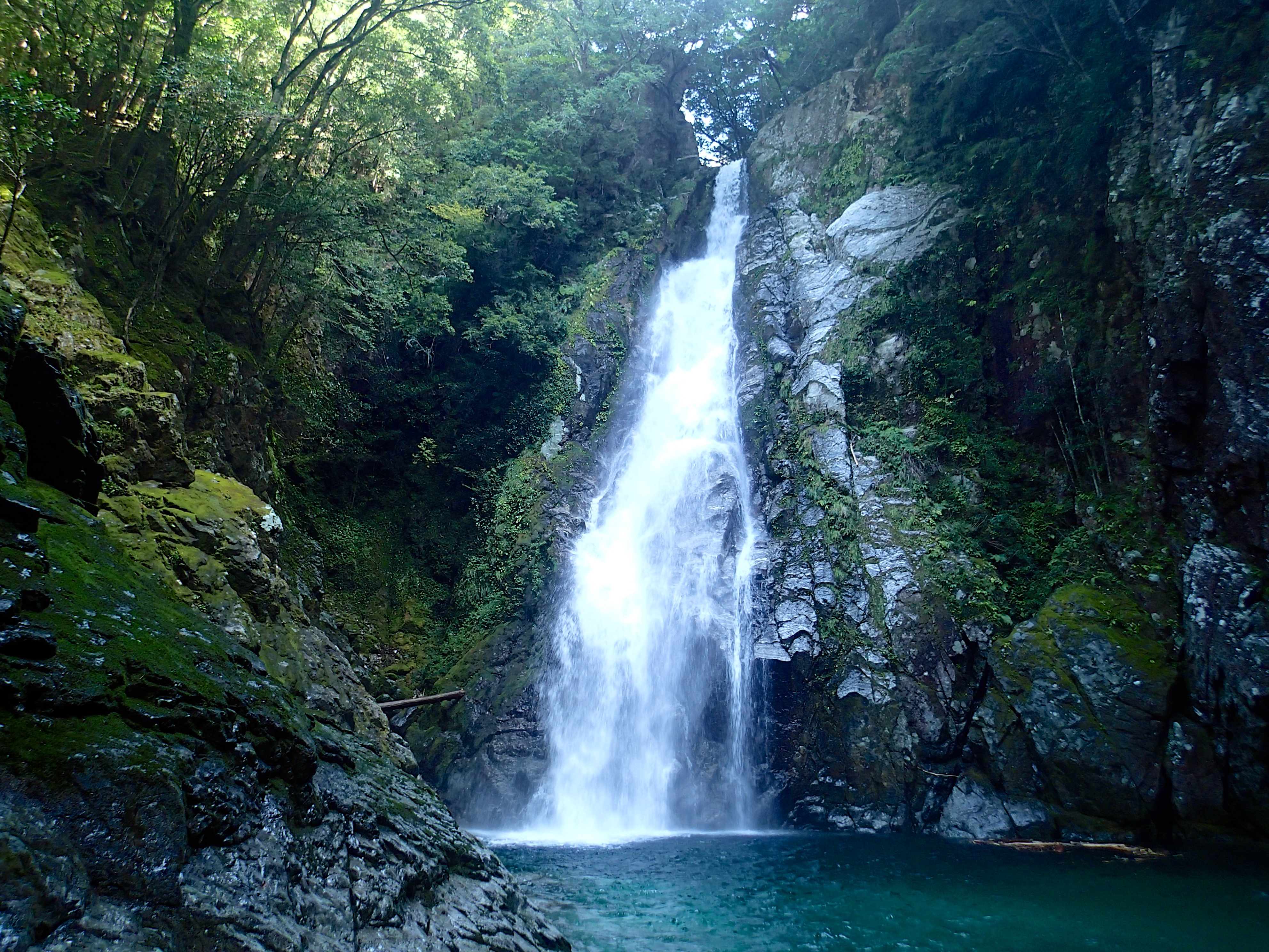 「銚子滝」を越して狭いゴルジュをS字状に曲がると、ハングした側壁に閉ざされた鬱蒼とした空間に、ひと際存在感を放つ「まぼろしの大滝(35m)」が登場。流石の迫力に圧倒される。