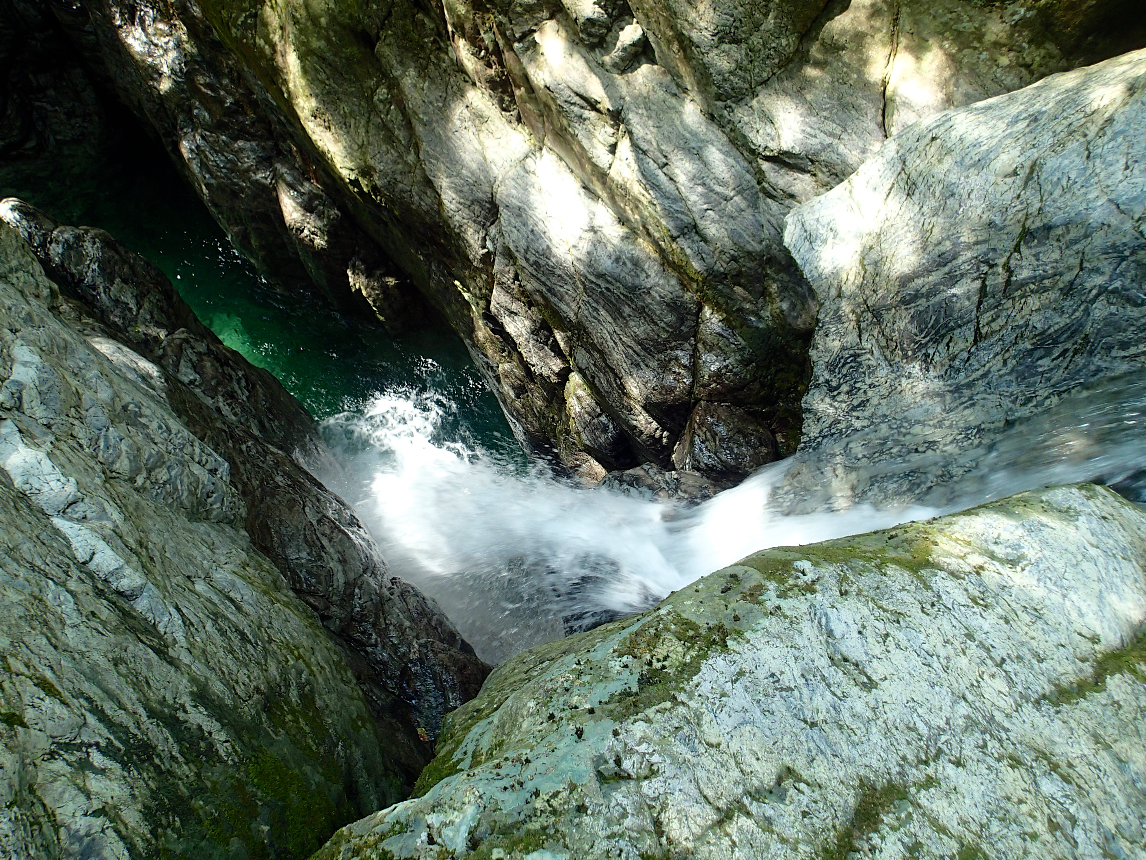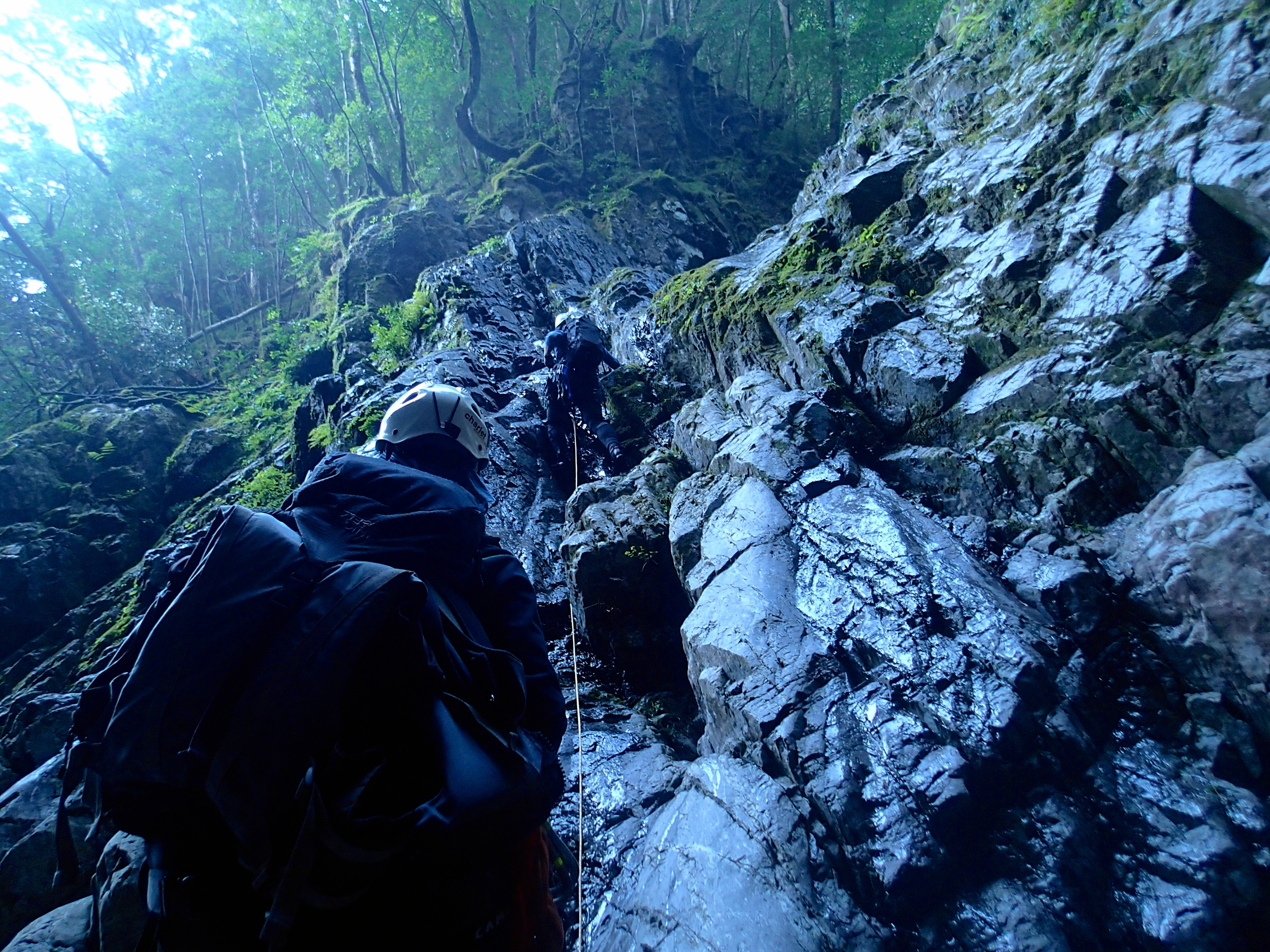 第6ゴルジュは、いきなり水流に抉られた2段10mと20mCS滝が並んだ壮絶な滝がでてくるので、左岸高巻き。これまで残置的なものはなかったのに、ここの巻きは何故か残置ロープがある。