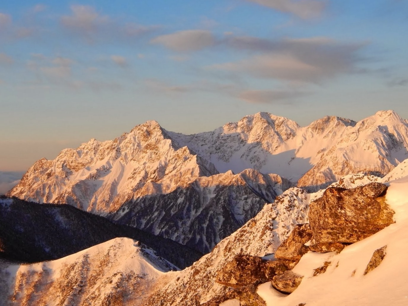 先々月行った明神岳、先月の北鎌尾根の稜線を眺め30分ほど山頂に滞在。