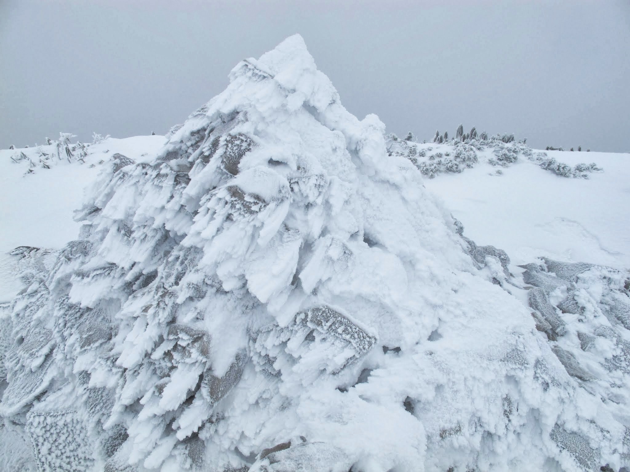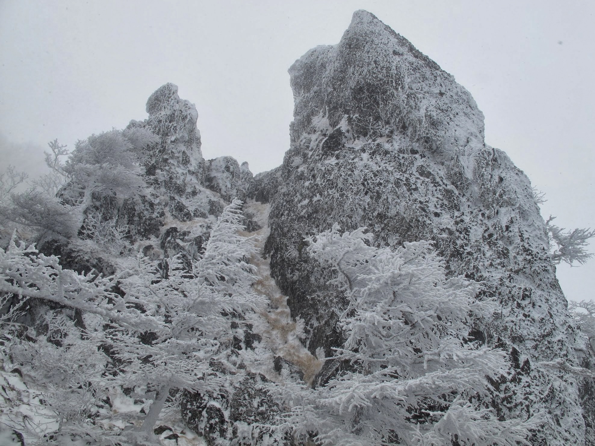 少し歩くとガスの中に迫力のある雪化粧の大天狗。それにしても寒い。