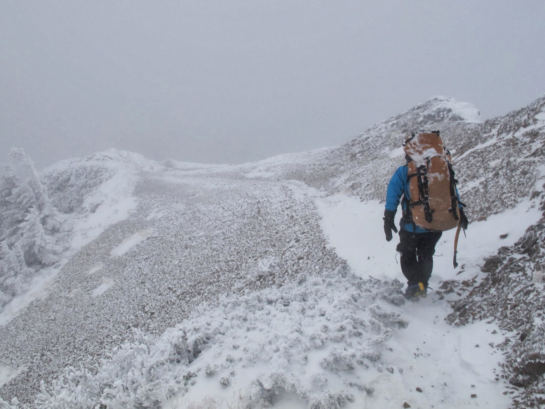 翌日はツルネを降りるだけなので遅めの起床。8:30出発。今日も風は強く、一晩でかなり降雪した模様。