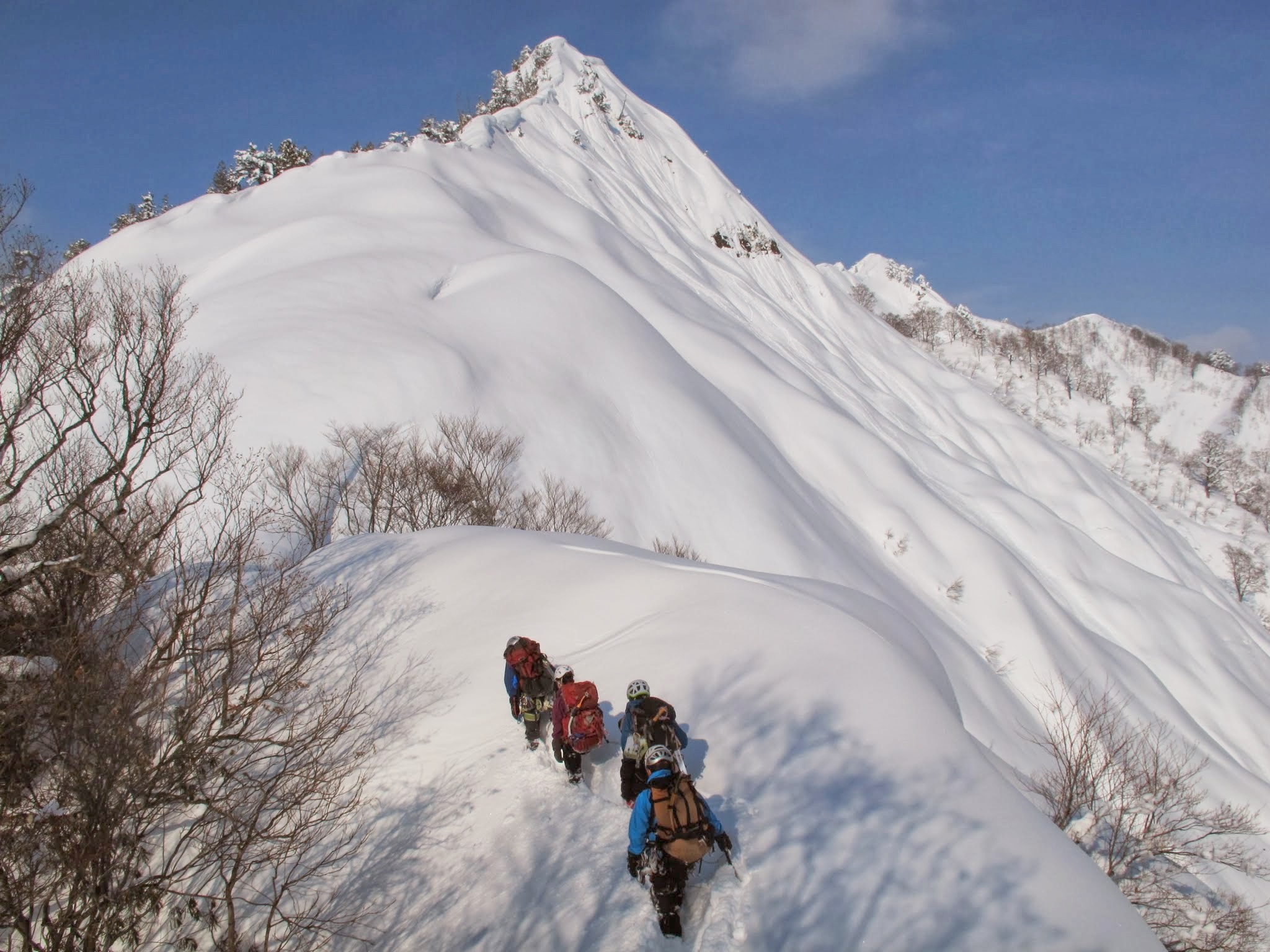まるで春山のような天気から翌日は一転して吹雪。上越のいろんな顔を見ることができた山行でした。パーティーの皆様、楽しい山行をありがとうございました。
