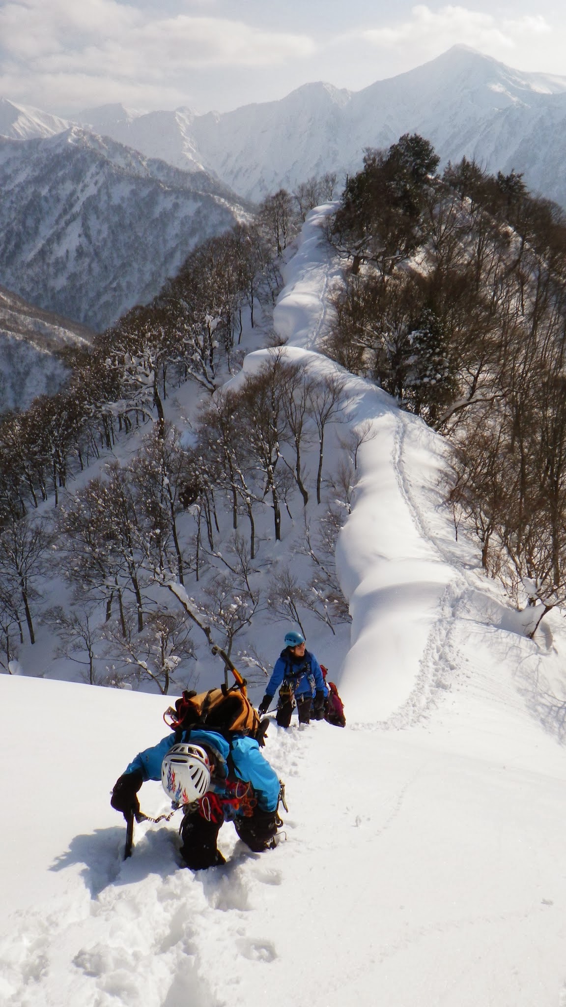 出発してほどなく稜線にのると、雪庇がみられ、なるべく樹林の際を通るようにとリーダーの指示。新人お二人は、傾斜が急な場所の胸ラッセルや、木の根っこなどの処理に手間取るが、軽快にのぼりあっというまに本日のBPへ到着。