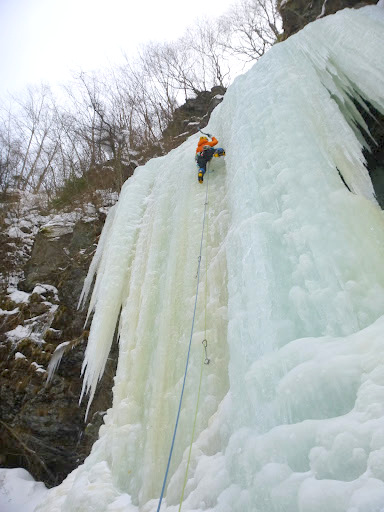 まず左岩壁エリアに向かうが、狙いの左ルート VI には陽が当たり始め、しゃばしゃばで登れそうにない。中央ルートの核心 F2のペンシル状氷柱は崩壊したままだし、右ルートの F2も氷柱が切れている。春を思わせる陽気は快適だが、アイスには不向きだ。右岩壁の氷柱は発達、左側壁上部の崩落した氷柱もだいぶ回復してきたが、登るにはまだ薄い。
