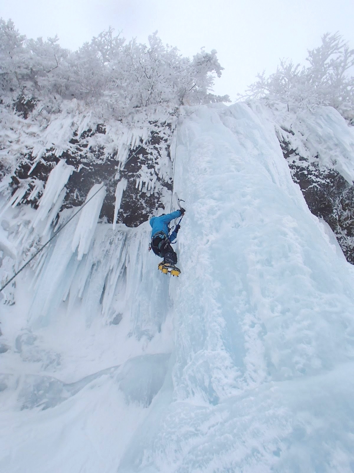 バーチカルはあまり好きでないと公言しているYさんと、いつも寝てる滝のアルパインアイスしか行ってなかったので、M田、こんな氷柱登れるはずもなく、残り1/3のハング越えはビレイヤーにトップロープをグイグイ引っ張ってもらって終了点にたどり着いた感じ(苦笑)。