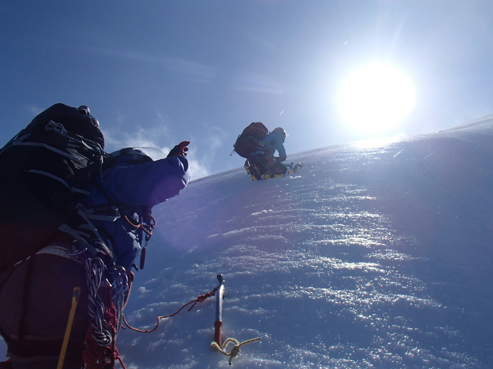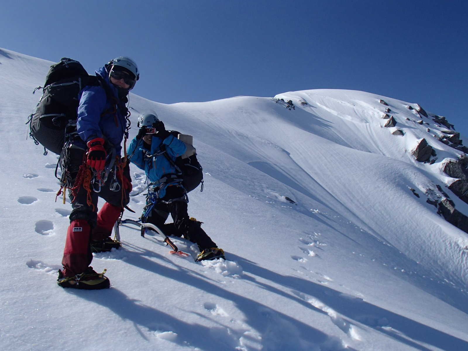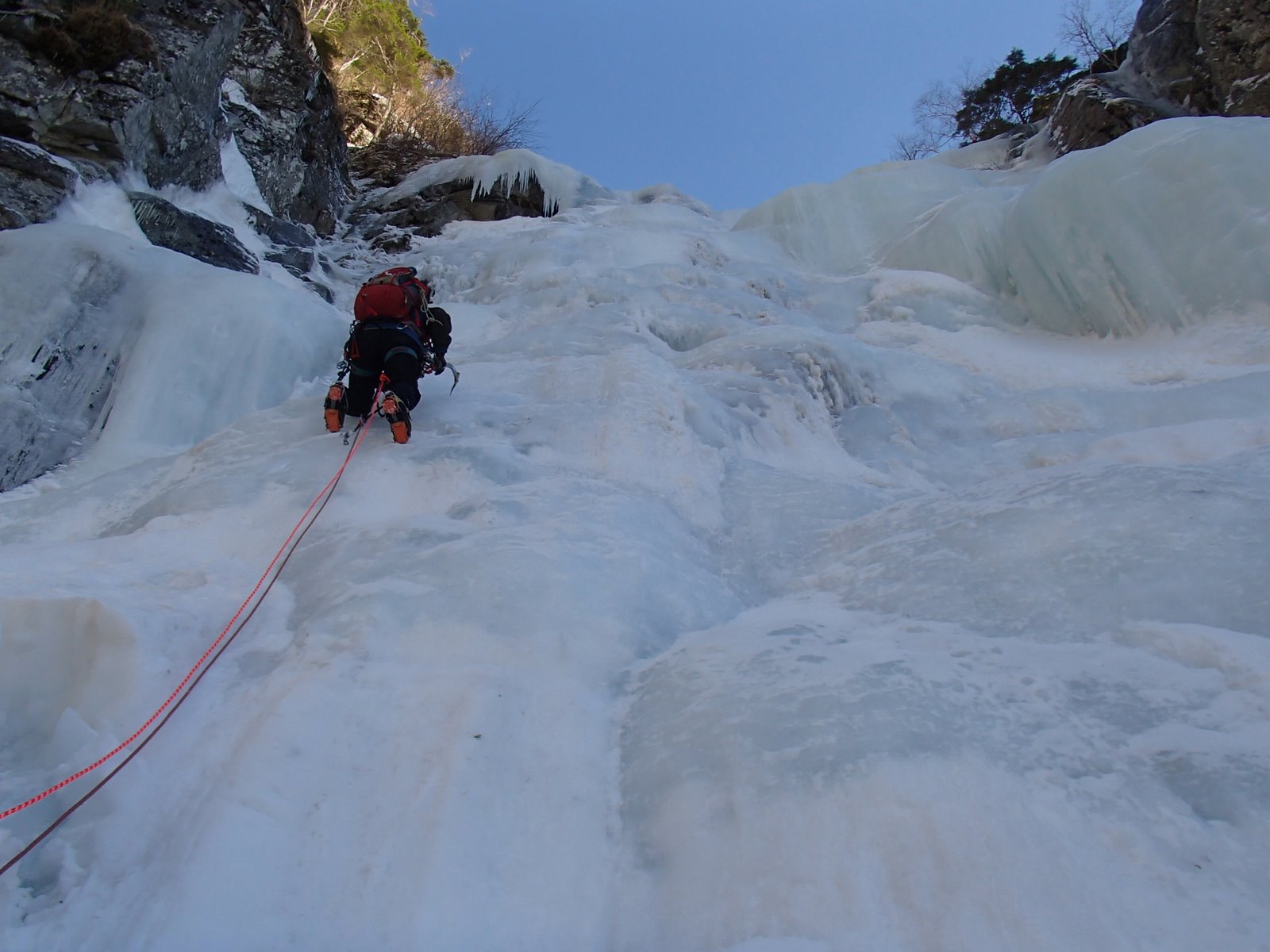 もう一つ、私の仲間内で検討されていることがある。アイゼンはモノが良いかデュアルが良いか?最新のアイスクライミングではモノポイントで登るのが良いと言われ、そうしてきた。しかし、最近上手い人でデュアルで登る人や海外のクライマーで、デュアルで登る人が結構いる。私も検証すべく、最近デュアルで登っている。表面が溶けかけた氷では絶対デュアルが良い。ただ、硬い氷では、どちらが良いか分からない。前爪2本を効かせて線で立ちこめば、安定間はデュアルかもしれない。ただ、つま先で登っている感じがない。それと、氷を壊すのはデュアルの方が大きい気がする。