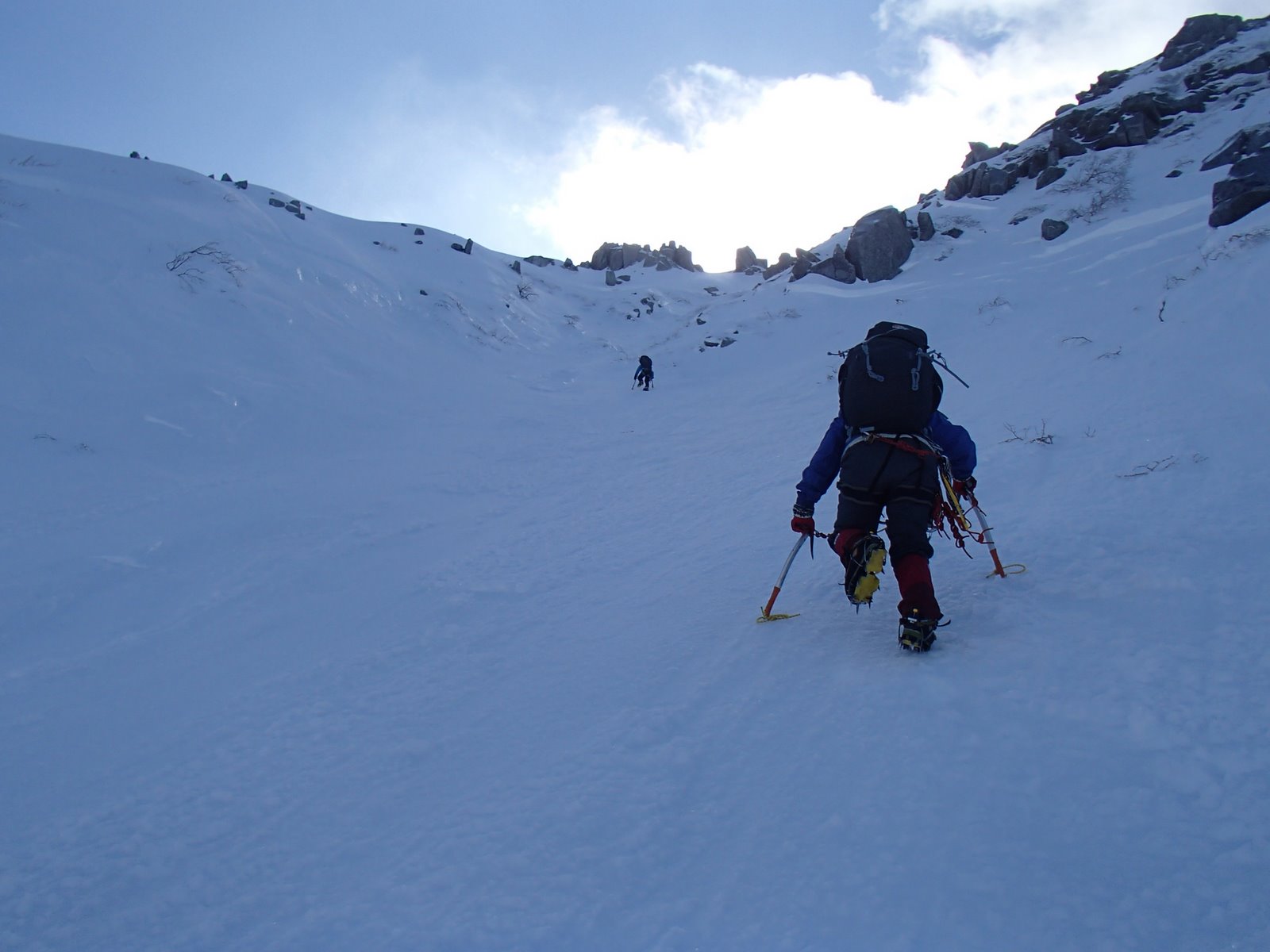 硬いアイス化した雪面で、ふくらはぎが悲鳴をあげる。すでに稜線では雪煙が舞っている。のんびり三ノ沢岳に登っていられないので、2550mあたりで左のルンゼに入って、早く稜線へ出ることにした。2750mあたりの稜線の肩に出る。まだ、青空が出ているが、宝剣の山頂の方はすでにガスが掛かっている。この時まだ9時半だった。