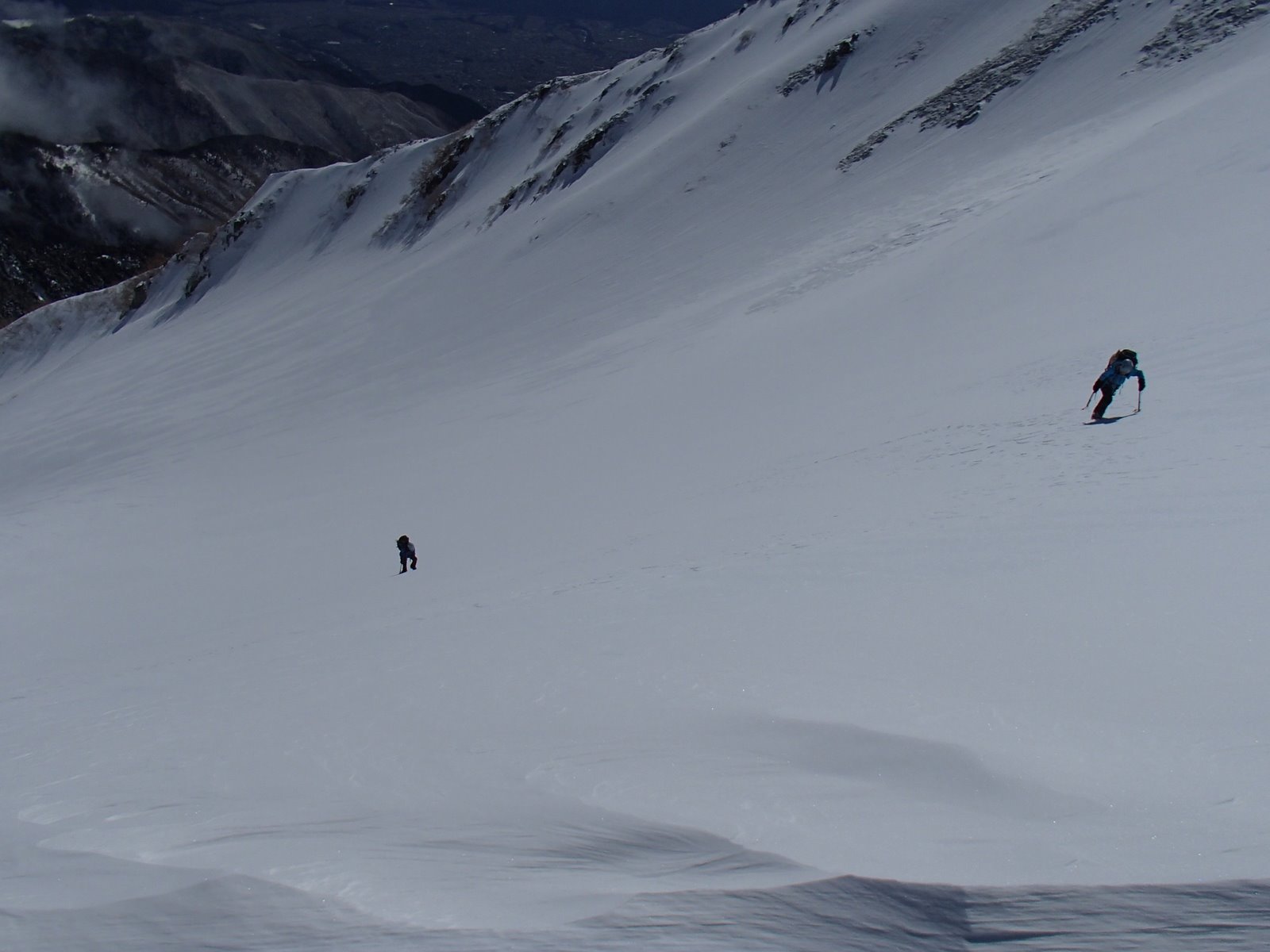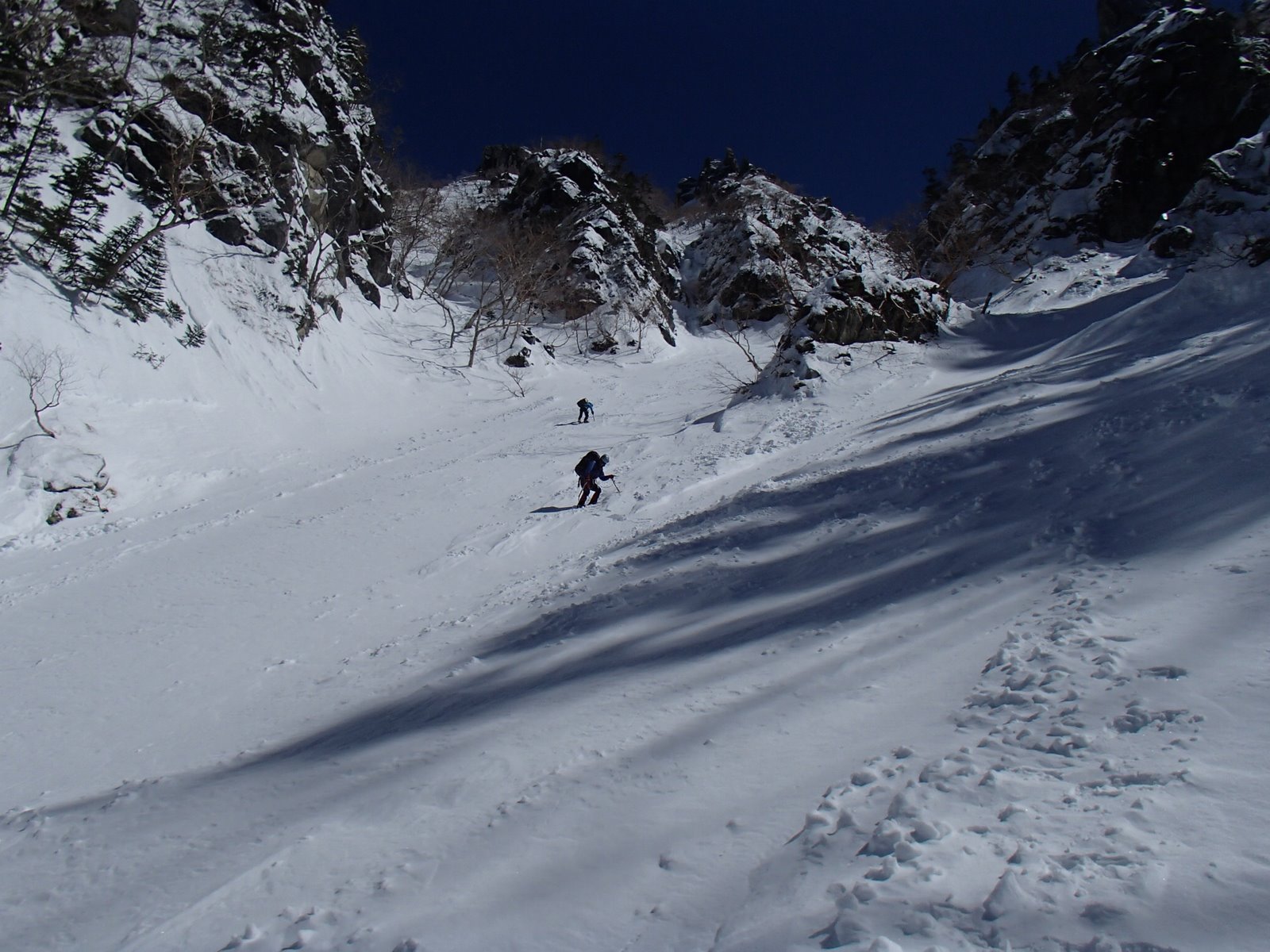 コルから四ノ沢を見降ろすと急な斜面が続いている。しばらくは前を向いて下れたが、やがて雪崩によって硬くなった斜面となり、バックステップで下降する。雪が硬いので、気が抜けない。