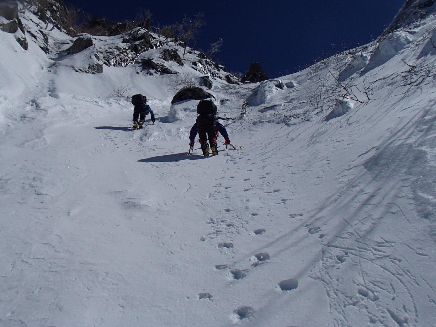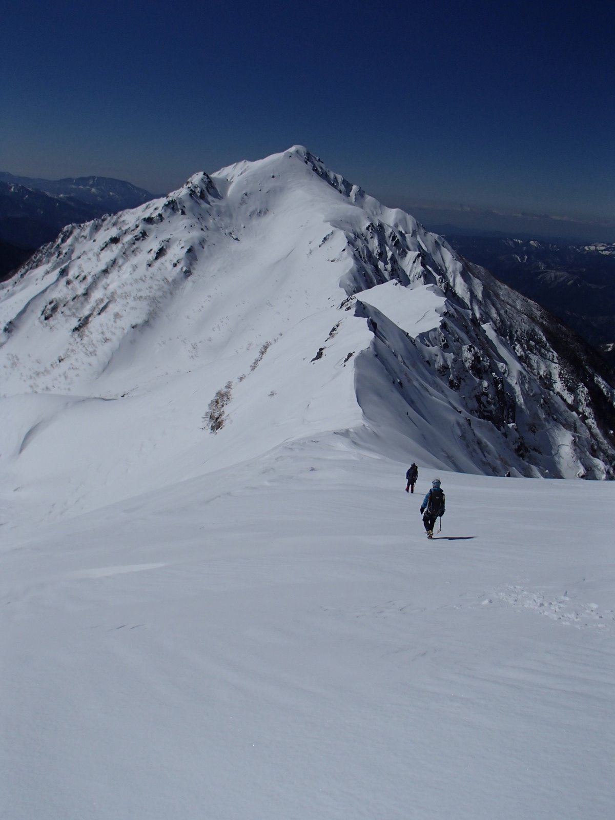 千丈敷カールから極楽平までラッセルがあるかもしれないと思いワカンを用意してもらったが、杞憂に終わる。雪面に出るとカリカリに硬い。ワカンは神社の脇にデポする。代わりにアイゼンを装着。サクサクと快適に斜面を登ること1時間弱で極楽平に着いた。快晴の素晴らしい天気で、これから向かう三ノ岳への稜線が目の前に飛び込んでくる。極楽平に登る登山者は我々だけで、この青空を独占する贅沢。