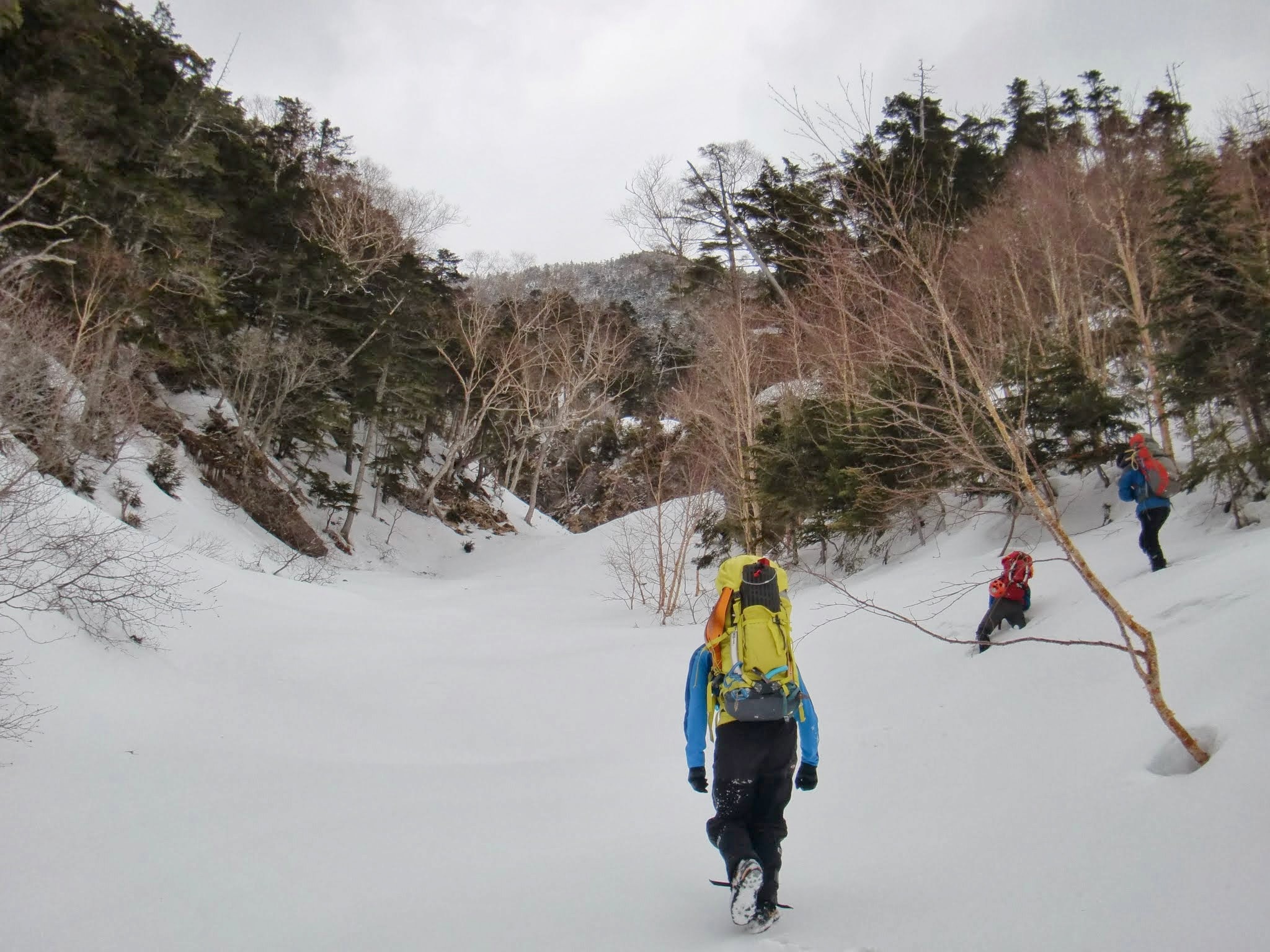 大門沢左岸の登山道を行き、その後はひたすら詰める。新雪はしばらく降ってないようでつぼ足で楽に歩ける。