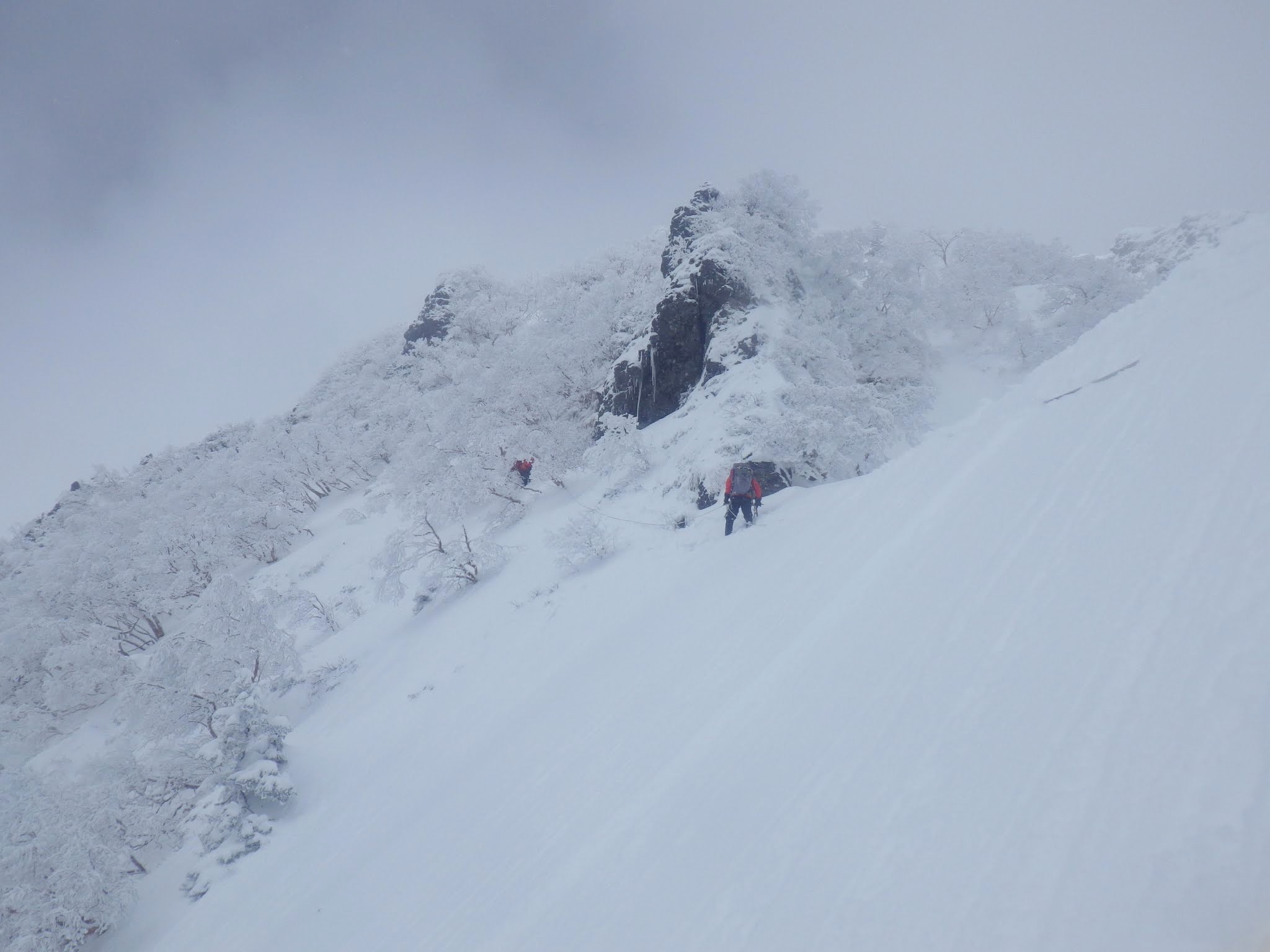 すぐに第一岩峰にあたり、左にトラバースしながら登る。雪の状態が怪しく、ここらで2ピッチロープを出す。