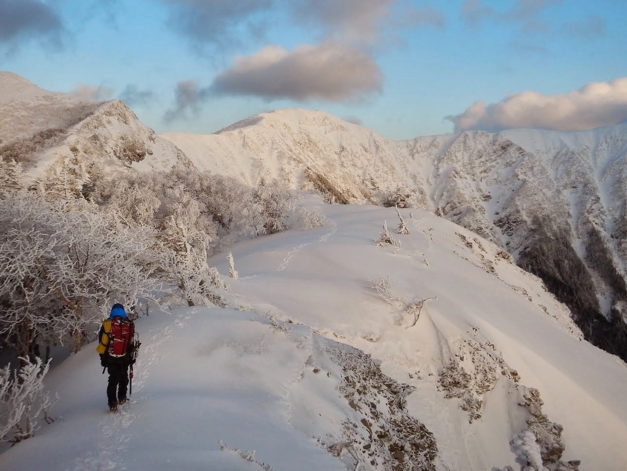 直後、アイゼンのみ装着して歩きだしたI田君が少し急な雪面で7mくらい落ちる。自ら滑落停止で事無きを得た。