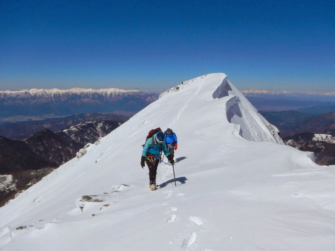 山頂直下の岩場はだいたい夏道通りに進み、T内さんのルーファイ指示に頼りながら、無事塩見岳西峰・東峰登頂。