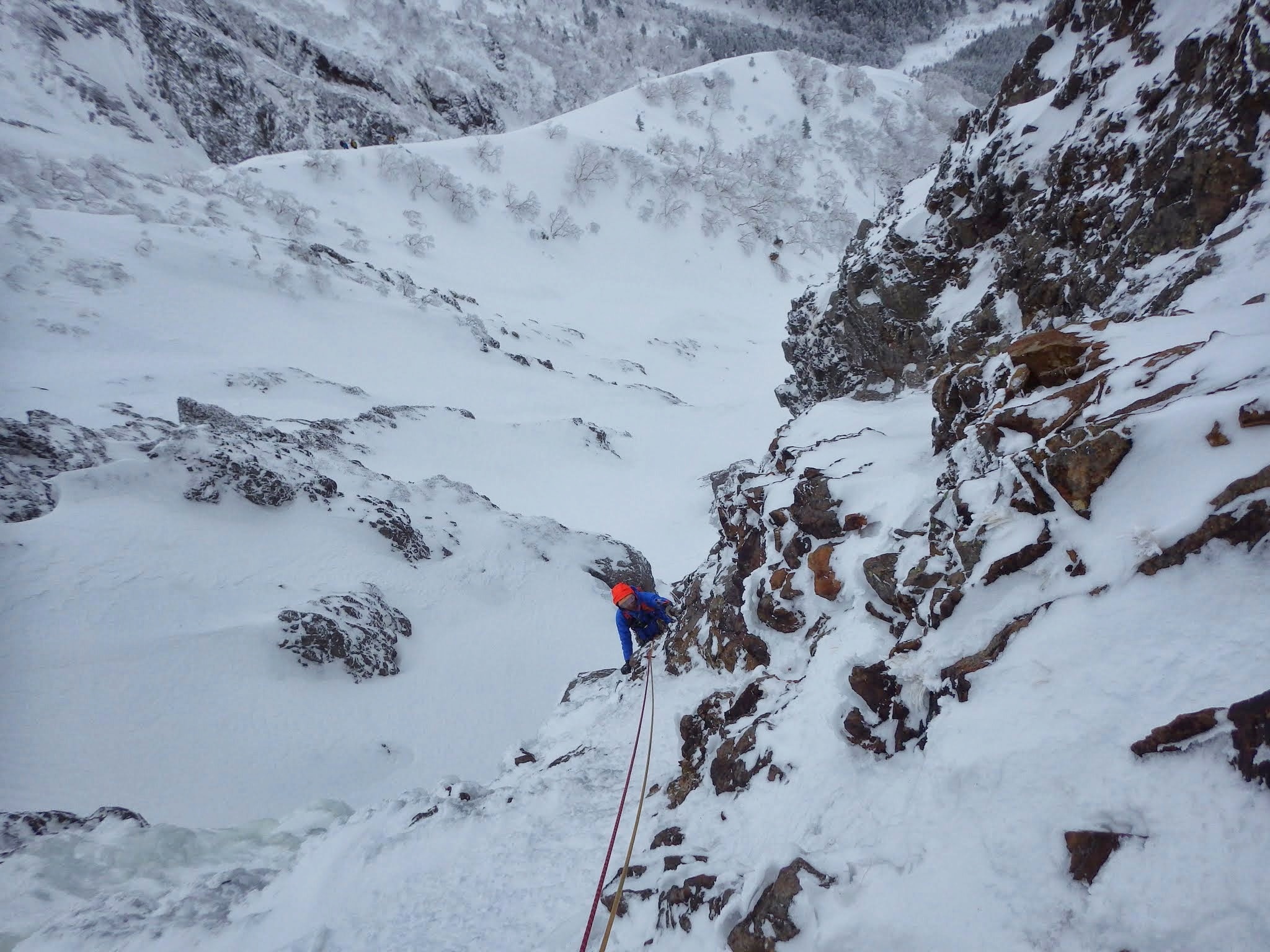 雪斜面登り、岩稜帯の手前でビレー。