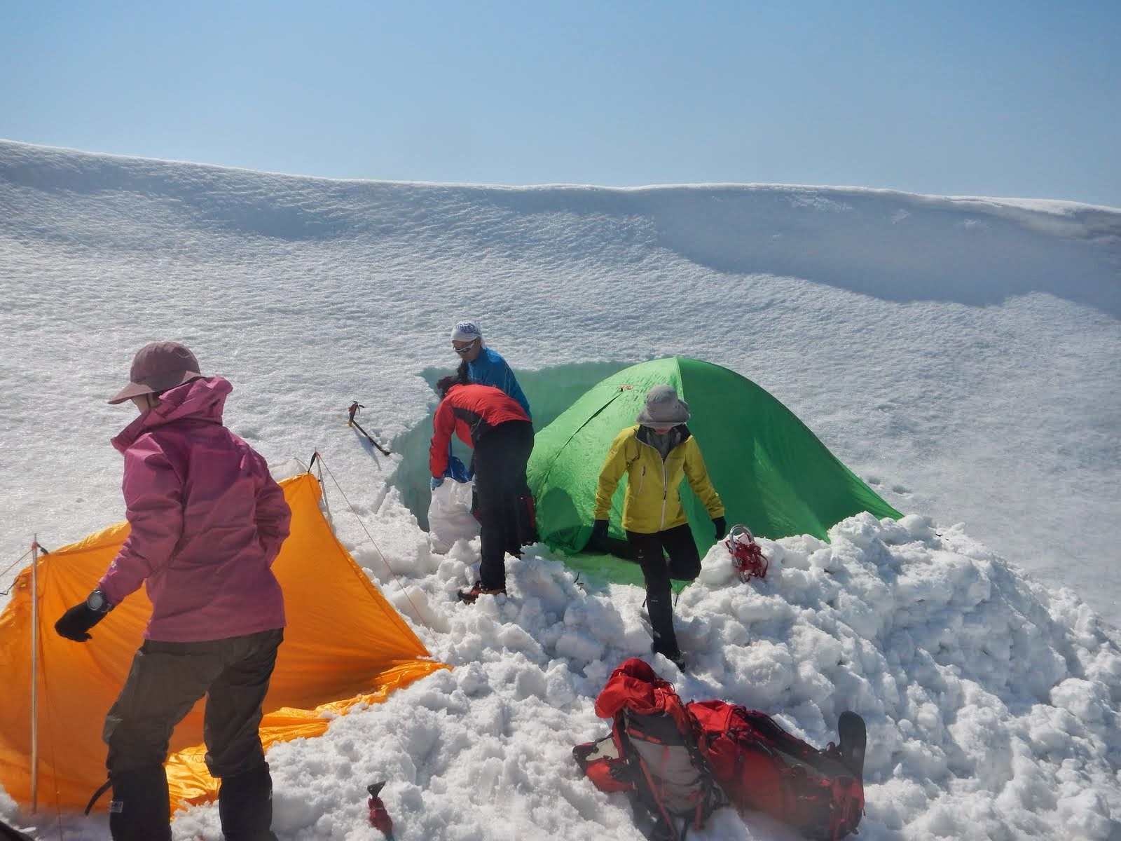 1,320mに絶好のテン場適地を見つけ昼過ぎに早々に設営。ここで山スキーに入った会員のM野さんと出会う。