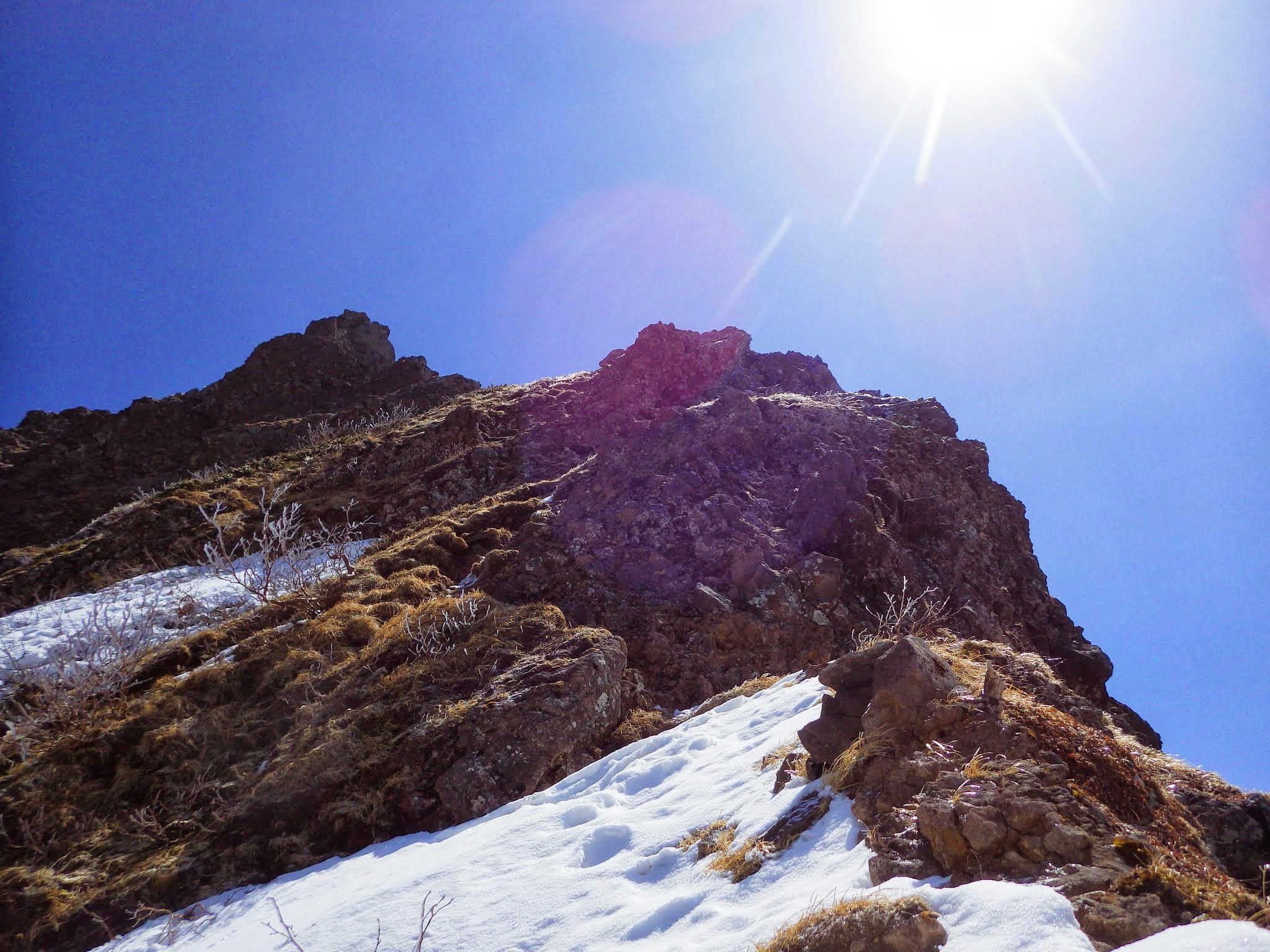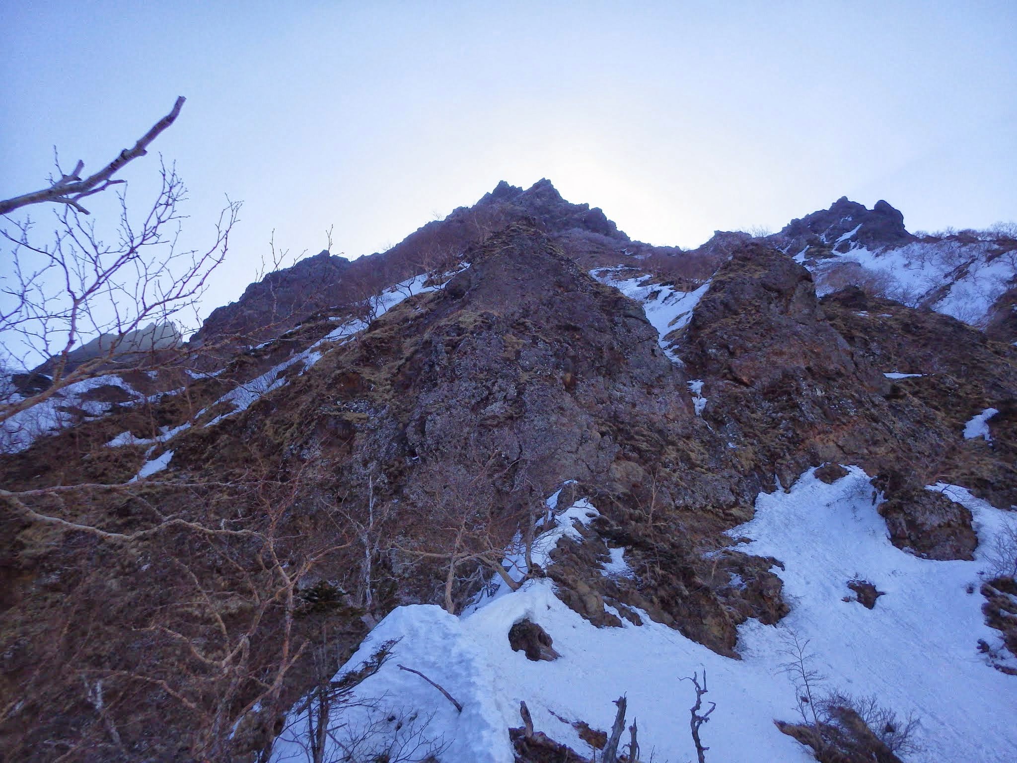 ここまで順調。天候も抜群。右にトラバースすればすぐに登山道だが、左の凹角へ向かい日ノ岳ピークへ。ものすごく悪そうな氷が垂れてたが、その左壁を登って右にトラバースするのがルート。 出だしだけちょっと慎重に、あとは簡単な斜面を登れば日ノ岳ピーク。