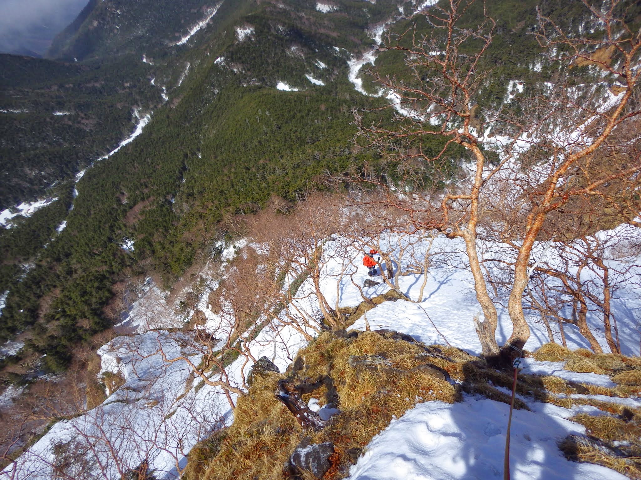 左から巻けるらしいが、直上する。ピナクルの裏側にハンガーボルトが2つあり、そこでピッチを切る。ここからすぐそこに登山道が見える。しばし休憩。