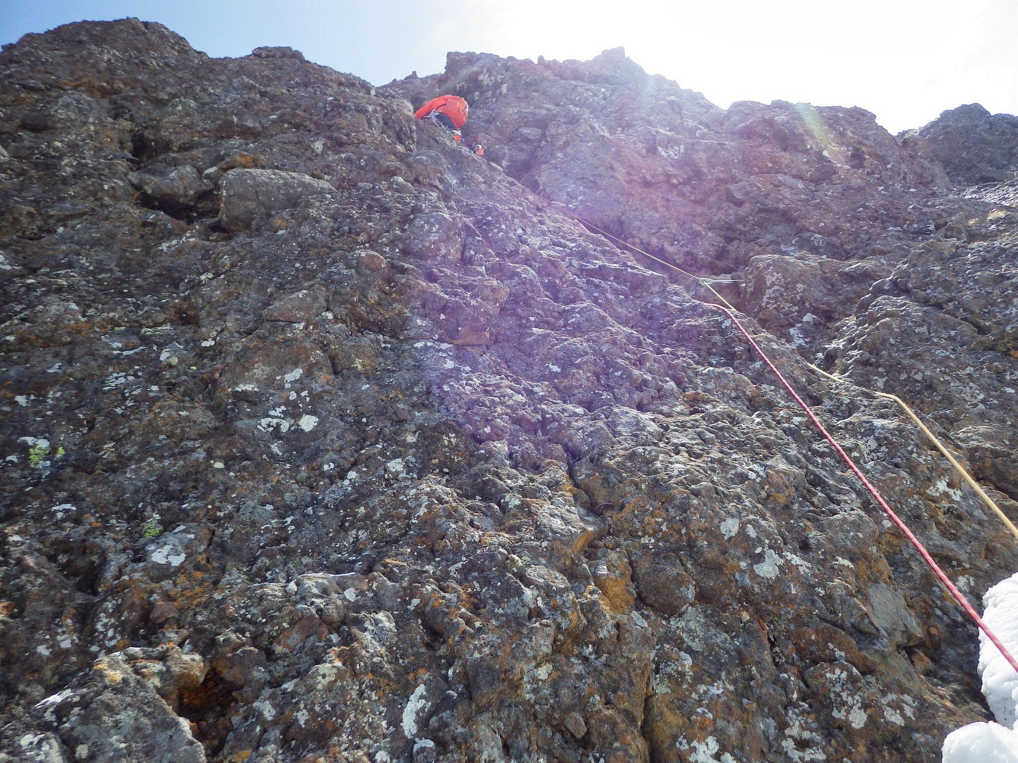 ここは、左の草付きから巻くこともできるらしいが、凹角直上へ。カムも決まるし、残置も沢山ある。岩には先人たちのアイゼンの後もある。安心して登れる。