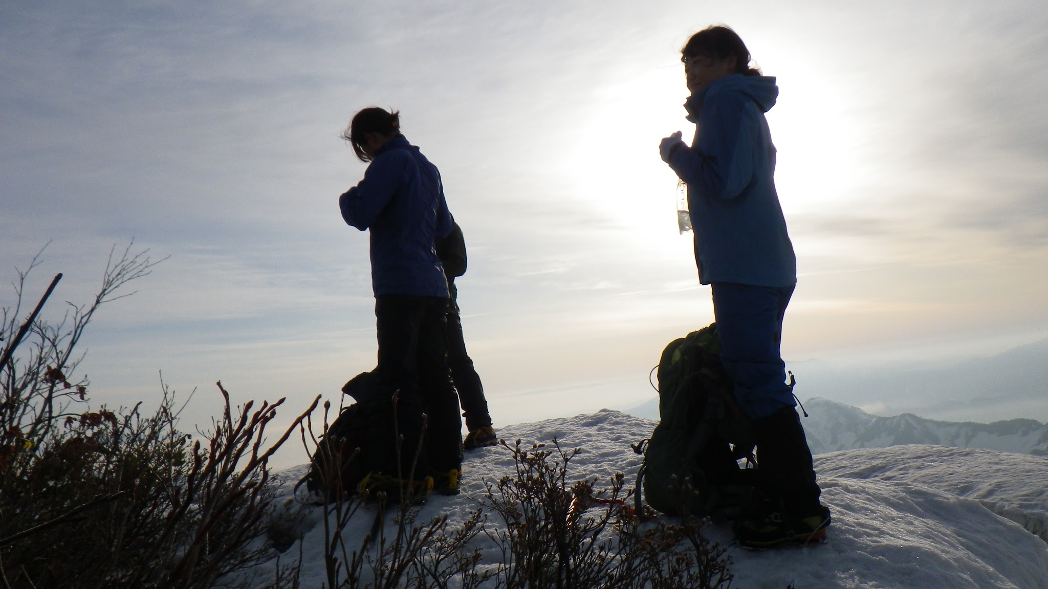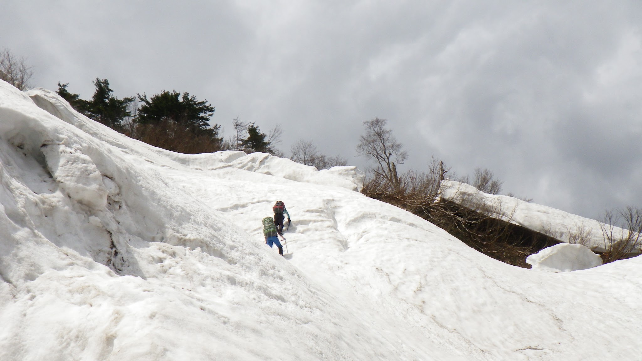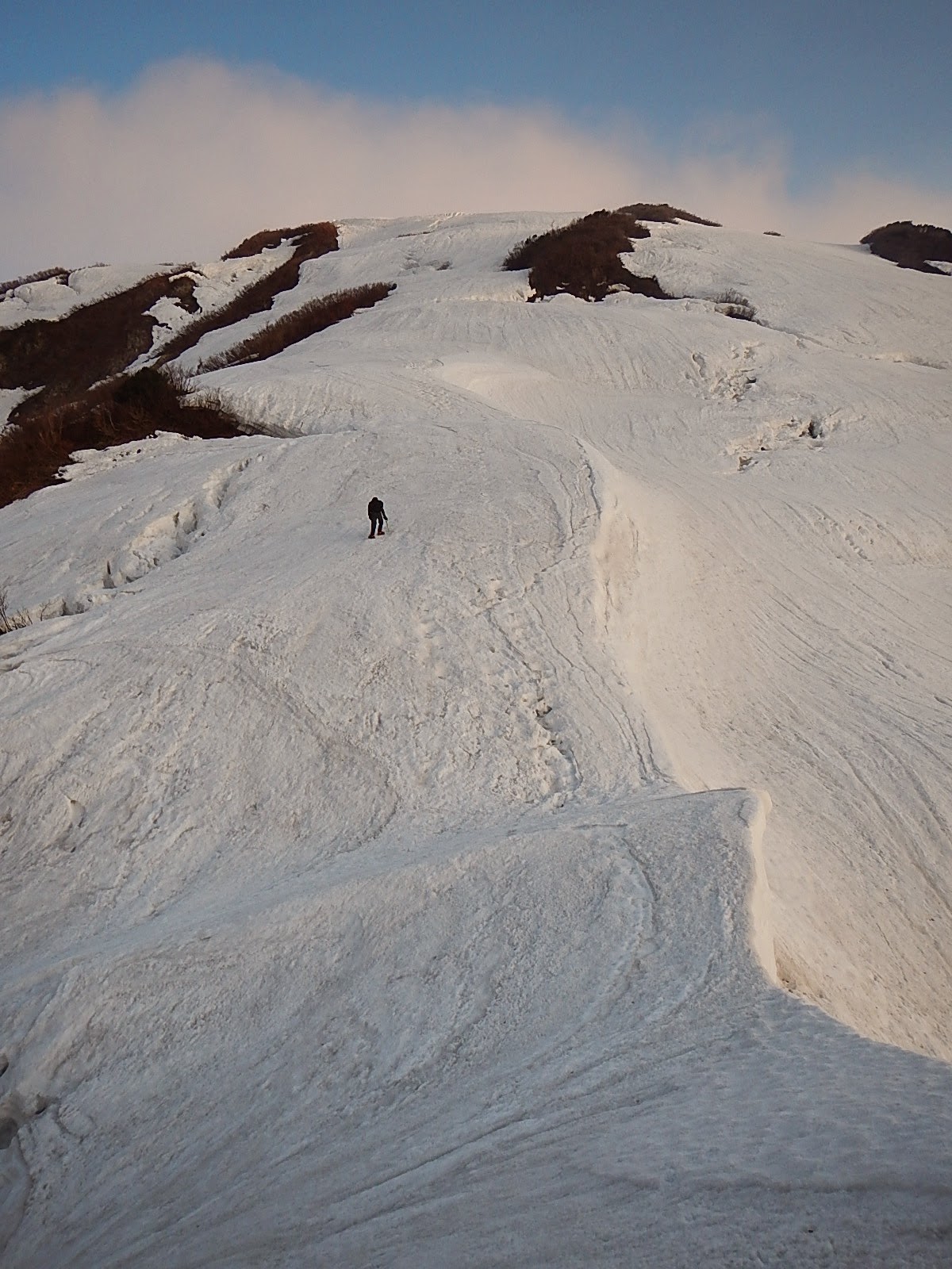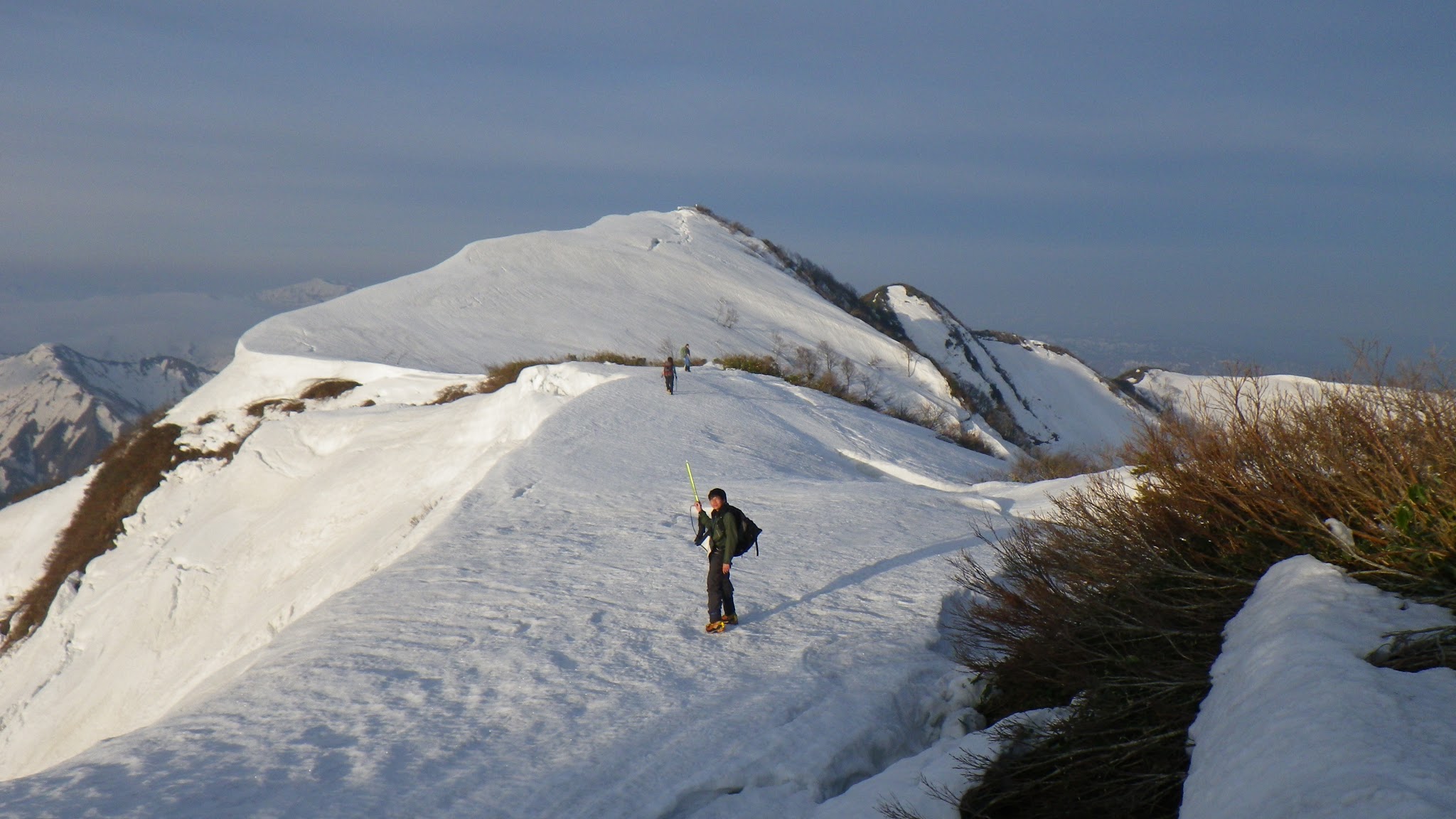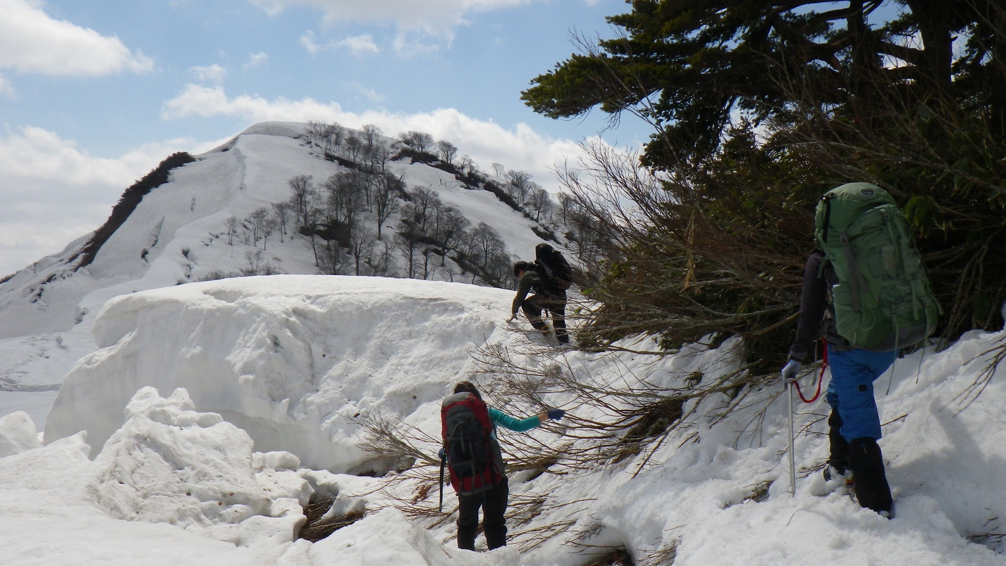 魚止山までは3時間弱。尾根のヤブをかき分けるか、ブロックにビビりながら斜面の雪を利用することになる。この日に関しては雪の斜面を歩くのと、ブロックを避けて尾根のヤブを漕ぐのと半々ぐらいだった。