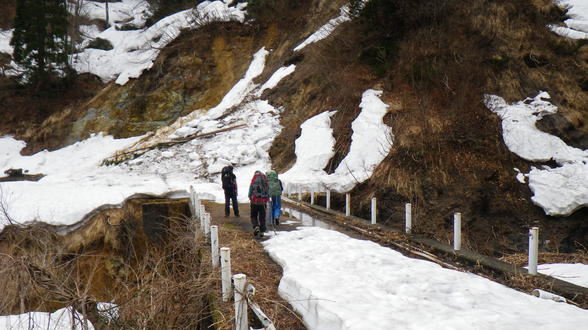 室谷洞窟駐車場に車を止め、林道終点付近取り付きまで1時間半ほど歩く。雪崩痕が各所にあり。