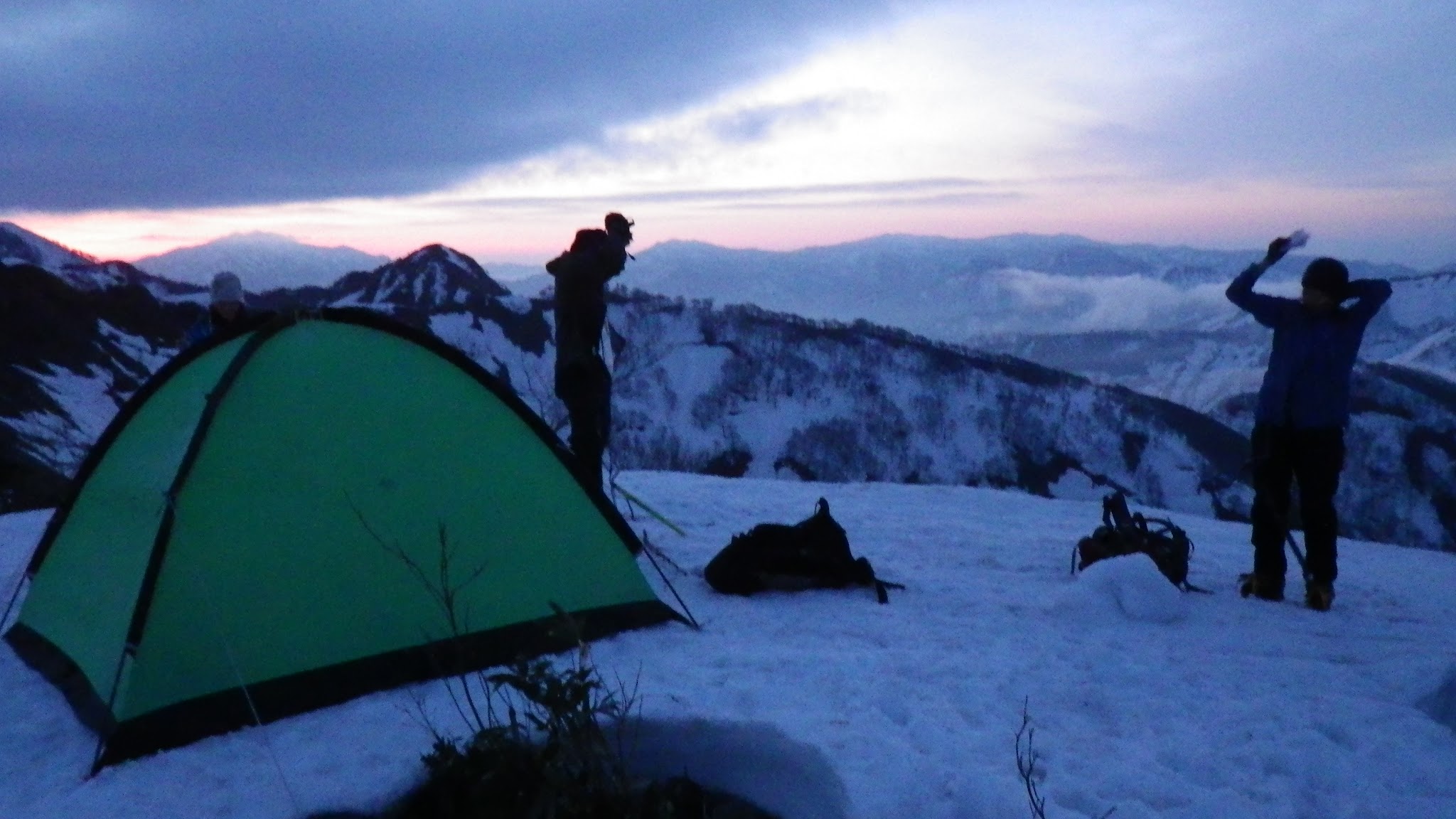 16時過ぎ1051標高点手前で幕営。夕間暮れのなか持参のつまみとHさんの生姜鍋で盛り上がった。