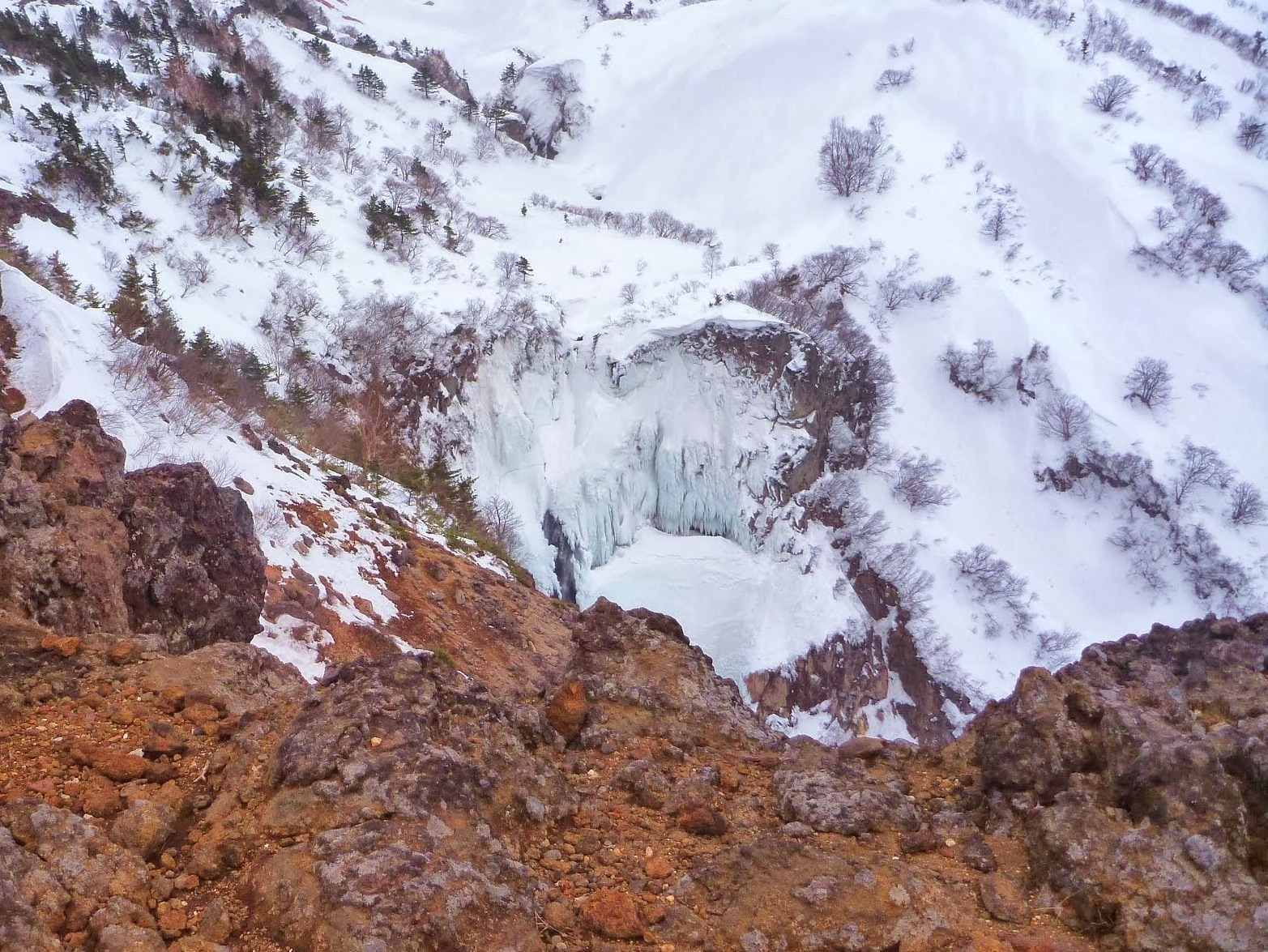 耐えて忍んで肩で息して、なんとか落ち口・・えっ!氷がなーい!ジタバタしてもしかたない、バイルを真下にぐぐーっと引いて、引っかけ~引っかけ~で登る。