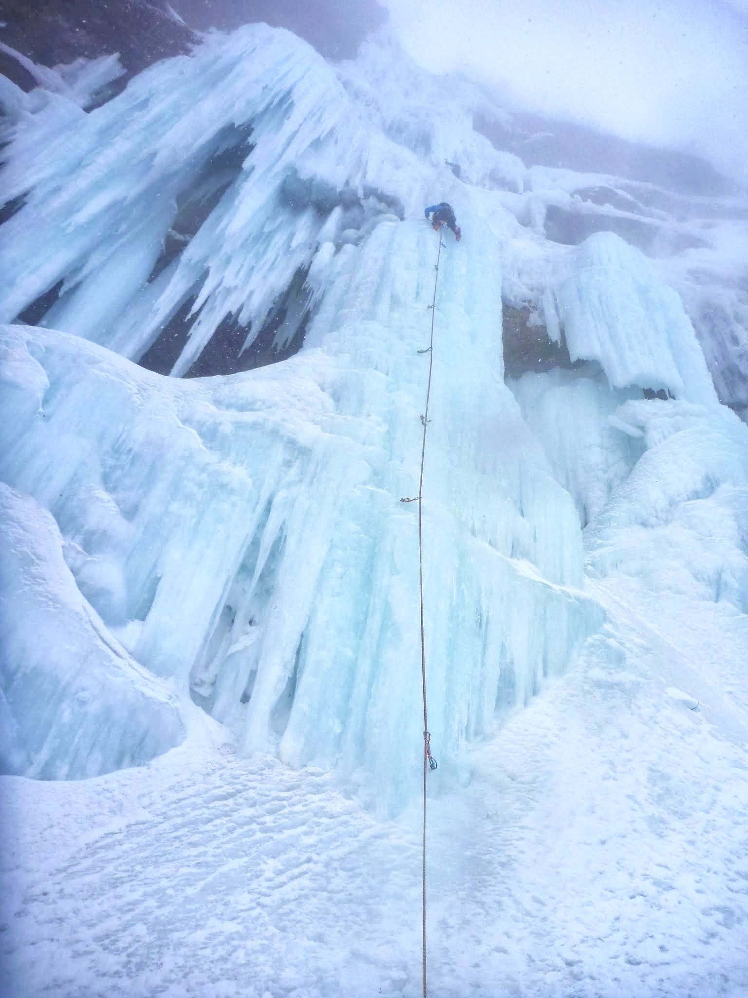 垂直のピラーからスタート、20mほど頑張ると傾斜は緩む。55mでスクリュービレイ。見た目にドーンとぶっ立ちなんで恐ろしいが、本当はWI5くらいかも。