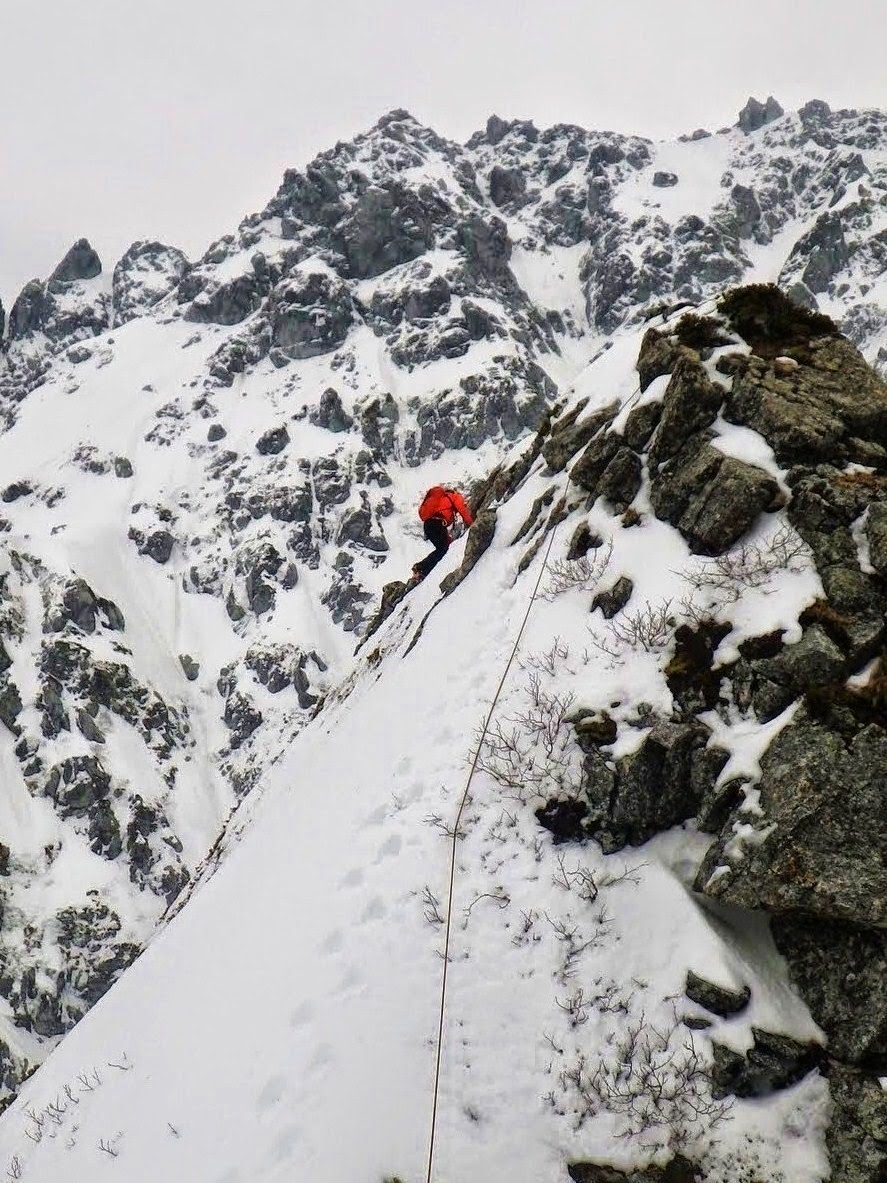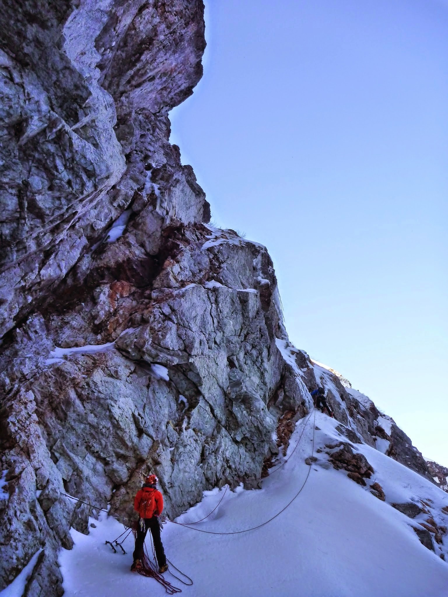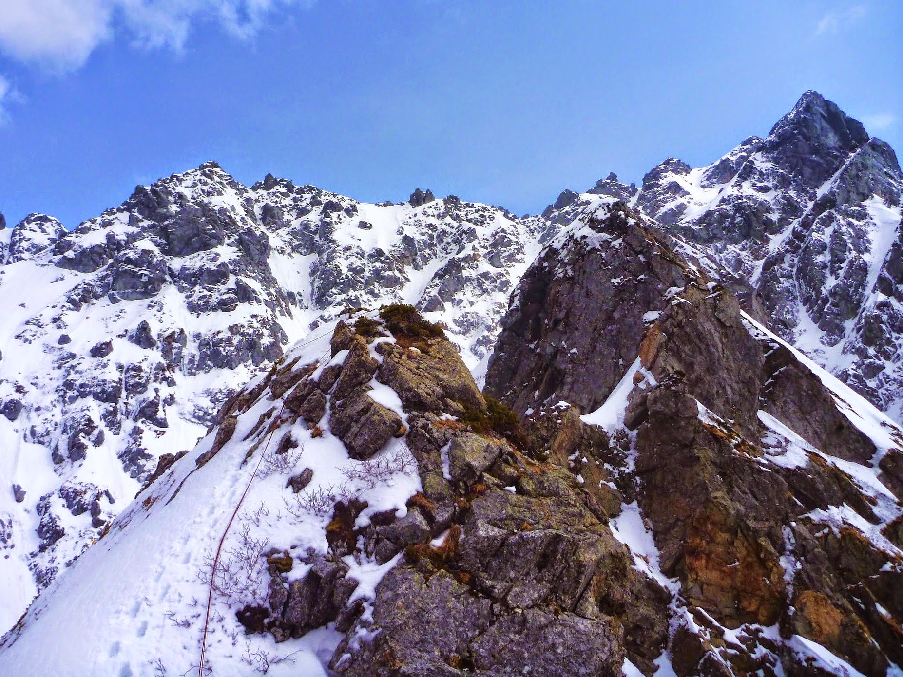 まだまだ転んだだけで死ねるのでザイルを出す。雪のリッジを少し歩いてから雪壁をクライムダウンする。這い松を束ねてビレイ。