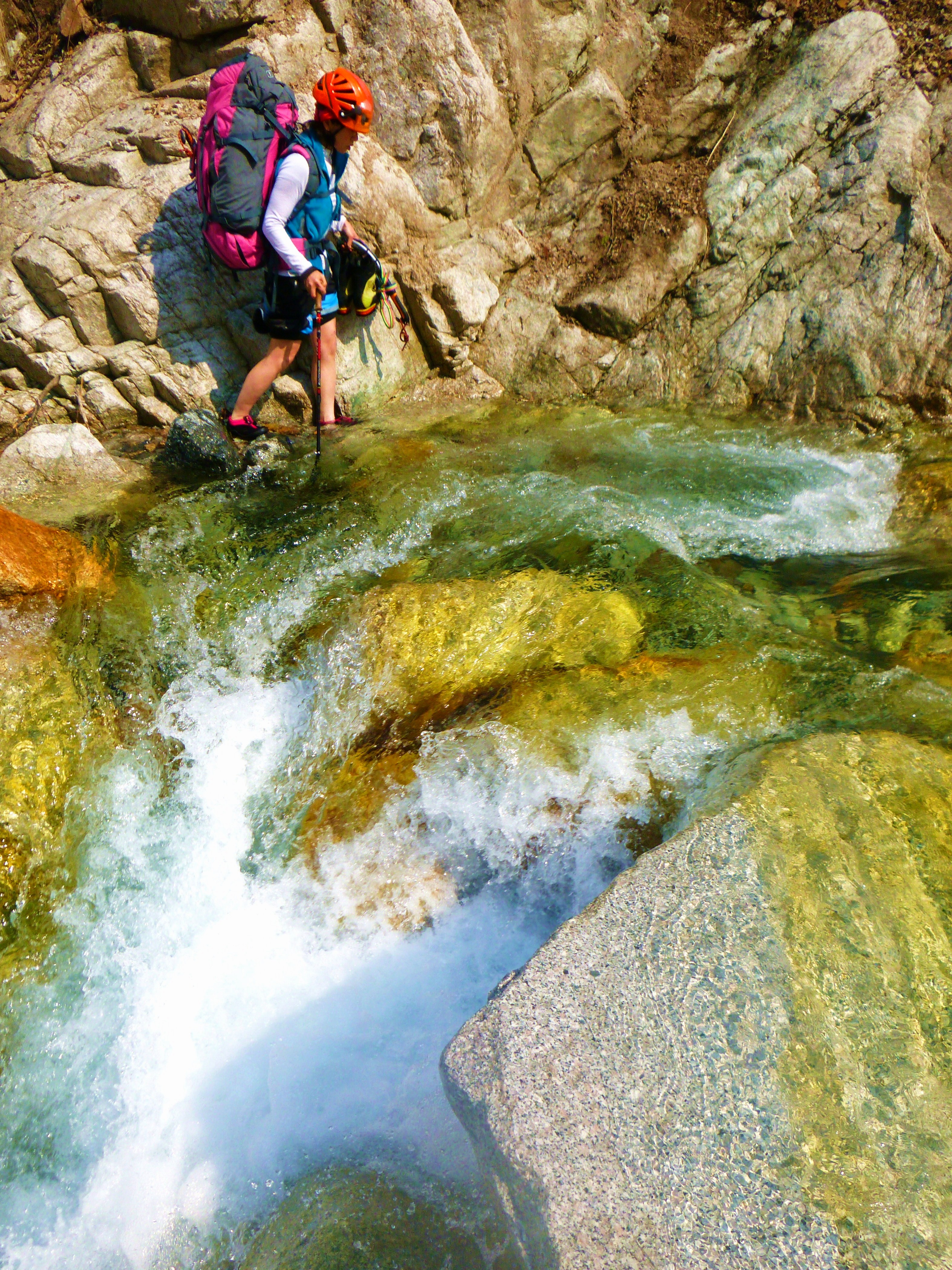 尖った岩のピナクルを登ってから急降下、リードよりフォローが恐い。ザイルが屈曲して動かなくなったのでフォローは前半をユマーリングする。