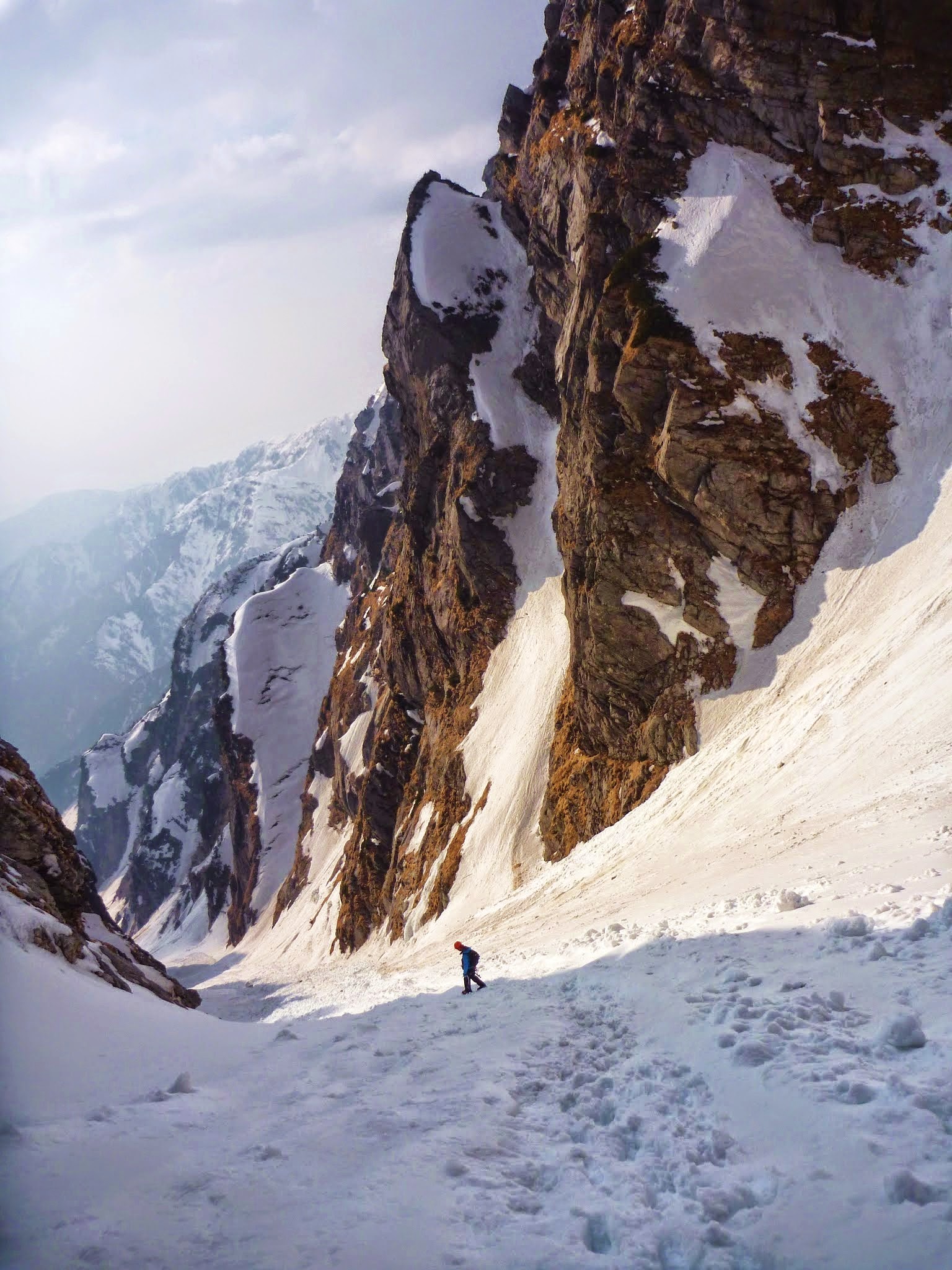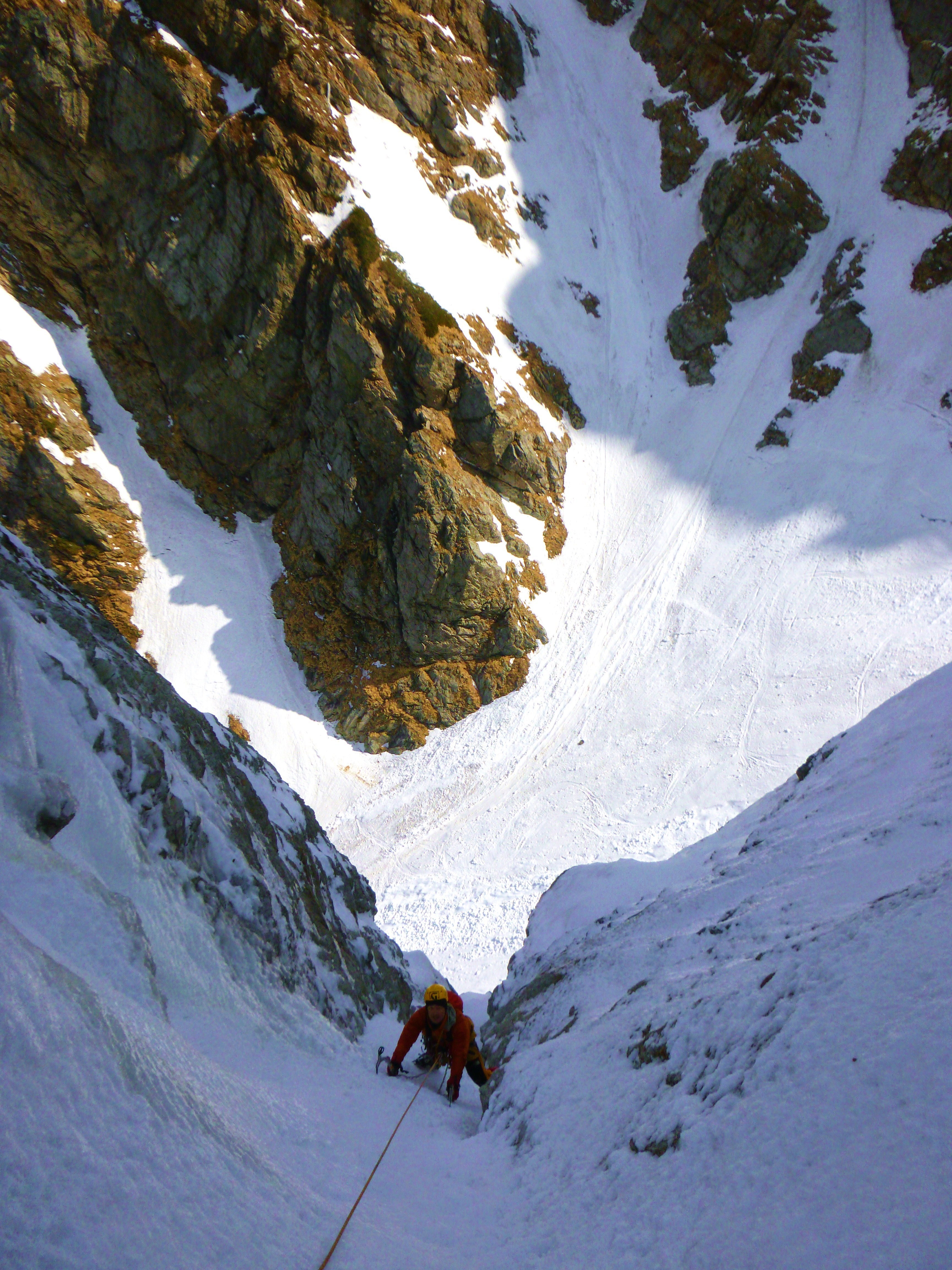 純粋な氷で中間部が垂直。後半の70度くらいの堅雪20mはランナウトする。眼下遥か下に池ノ谷が見える。ここもスクリュービレイ。