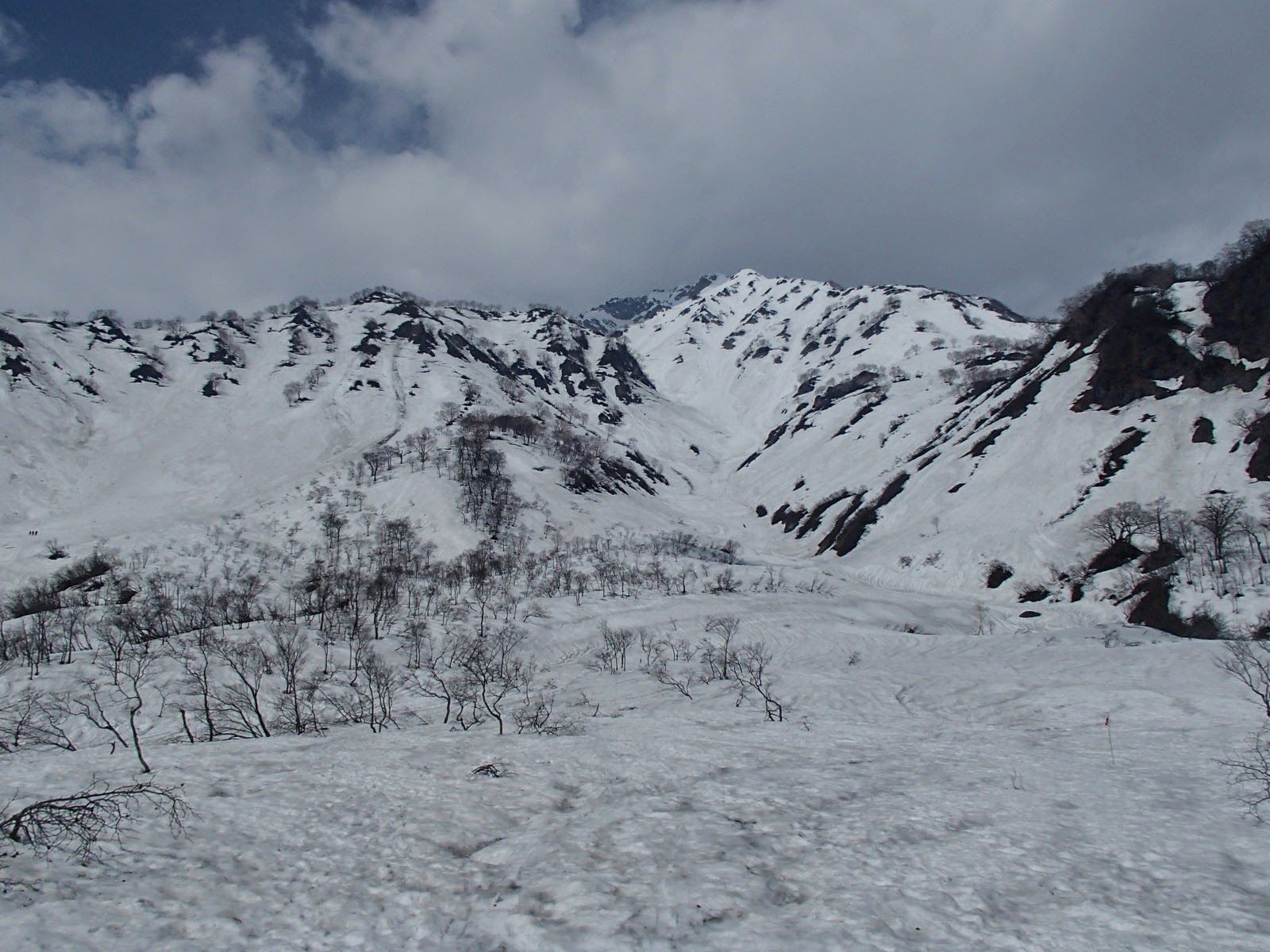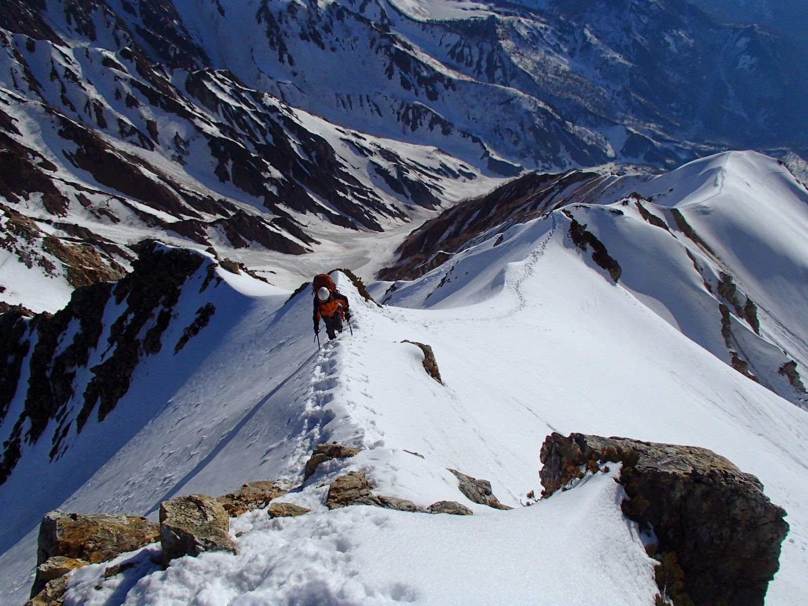 白馬鑓の登り返し後は、広くて緩やかな稜線歩きが続く。半分くらい夏道が出ていた感じ。広大な山々に囲まれ、本当に久しぶりの稜線漫歩。ここ数年、縦走路なんて沢の下山時くらい。T城さんは右手の立山方面をみて、剱はいいなーと言い。私は頸城の方ばかりを眺めている。天狗の大下りで一気に標高を約300m下げるが、上部は岩場と雪、一部ベルグラで結構悪い。懸垂こそしなかったが、何度かロープを出すか考える場面があった。(ルーファイで解決)