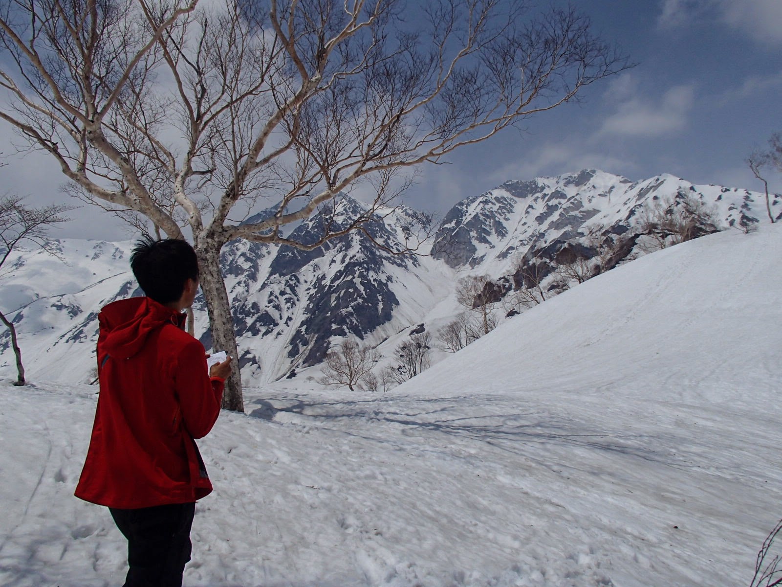 朝8時にJRで白馬駅に到着。猿倉までタクシーで移動。抜けるような青空と、どっしりとした白馬三山が出迎えてくれた。猿倉台地経由で小日向のコルから双子尾根にのる。尾根上はヤブが結構出ていて、ところどころ藪こぎを交えながら高度を上げていく。テン場予定地の樺平へは昼過ぎに到着。まっ白な広いコルに1本の樺の木が印象的。