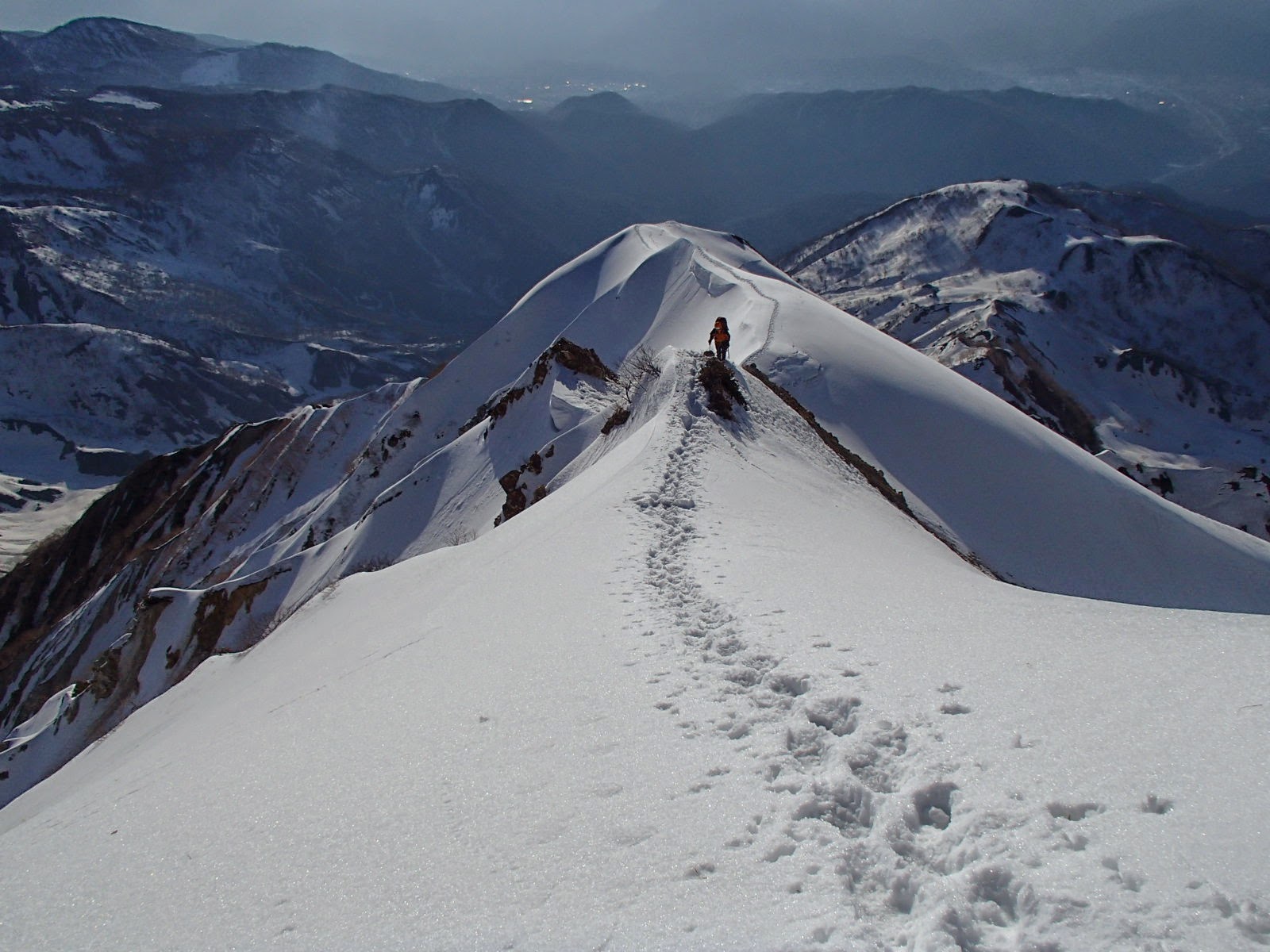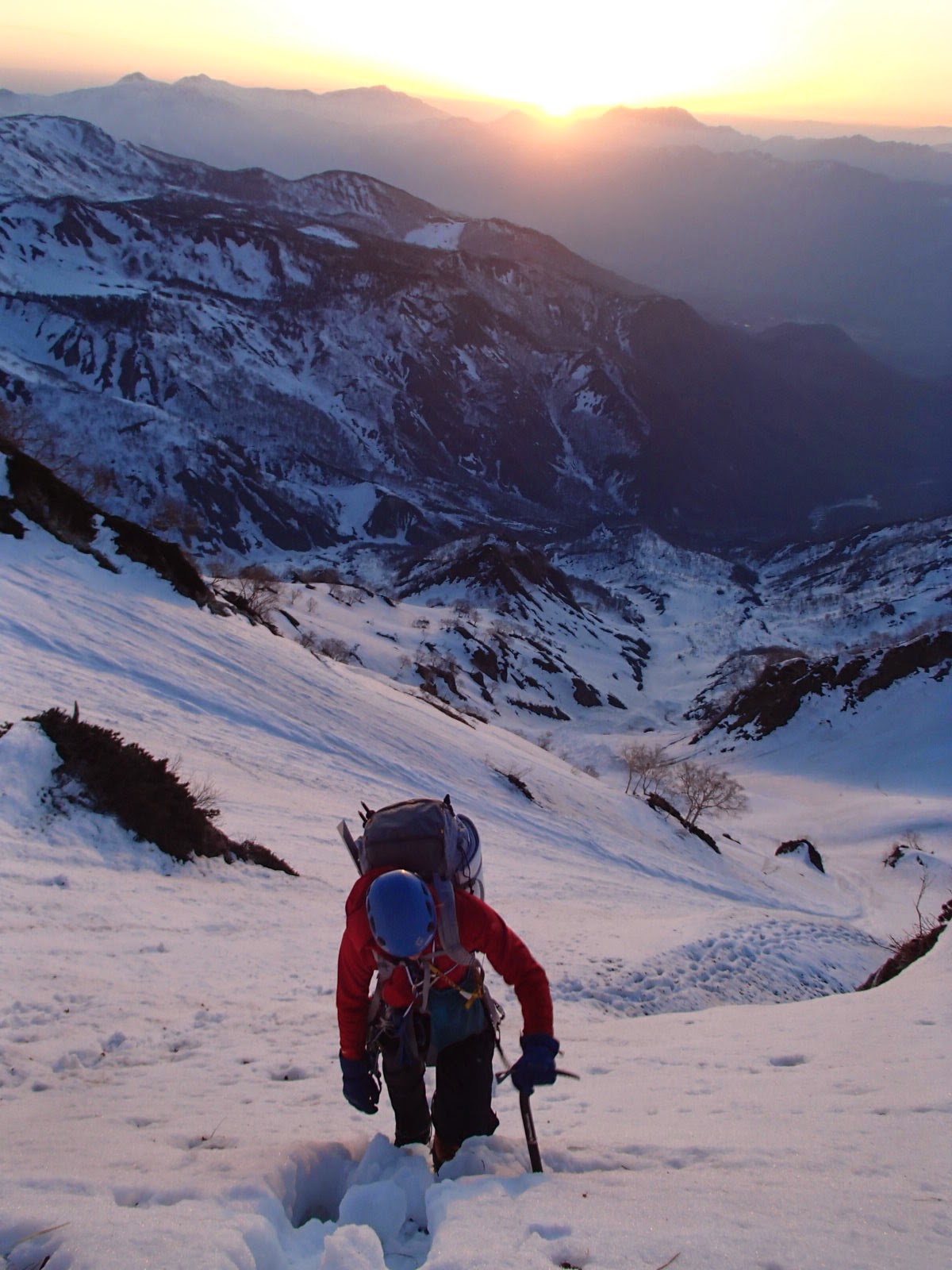 2時起床4時出発。時折強い風が吹くが空は快晴。最初の小ピークに達するころに日の出を迎える。樺平より上部はスノーリッジが続き快適な雪稜登高を楽しむ。ロープは未使用。
