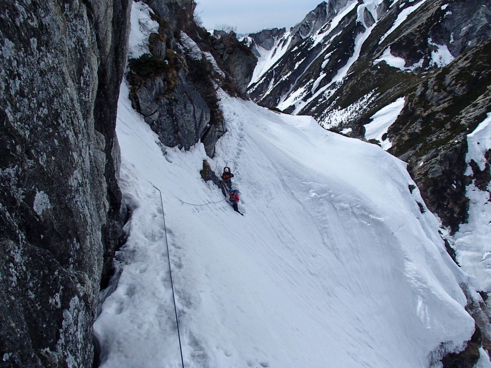 ルンゼ状の雪壁を斜上気味にトラバース。ブッ立っているけど雪は安定していて快適。