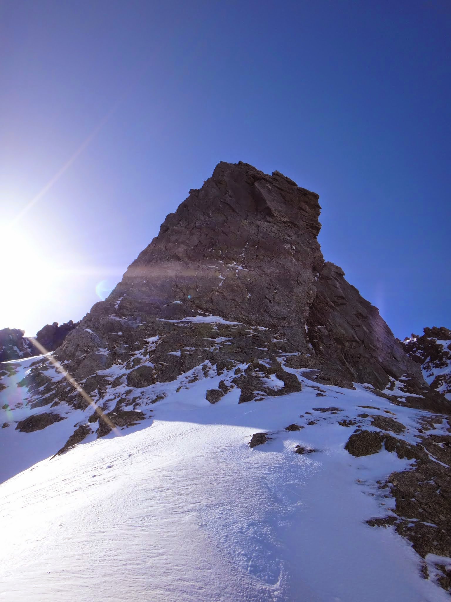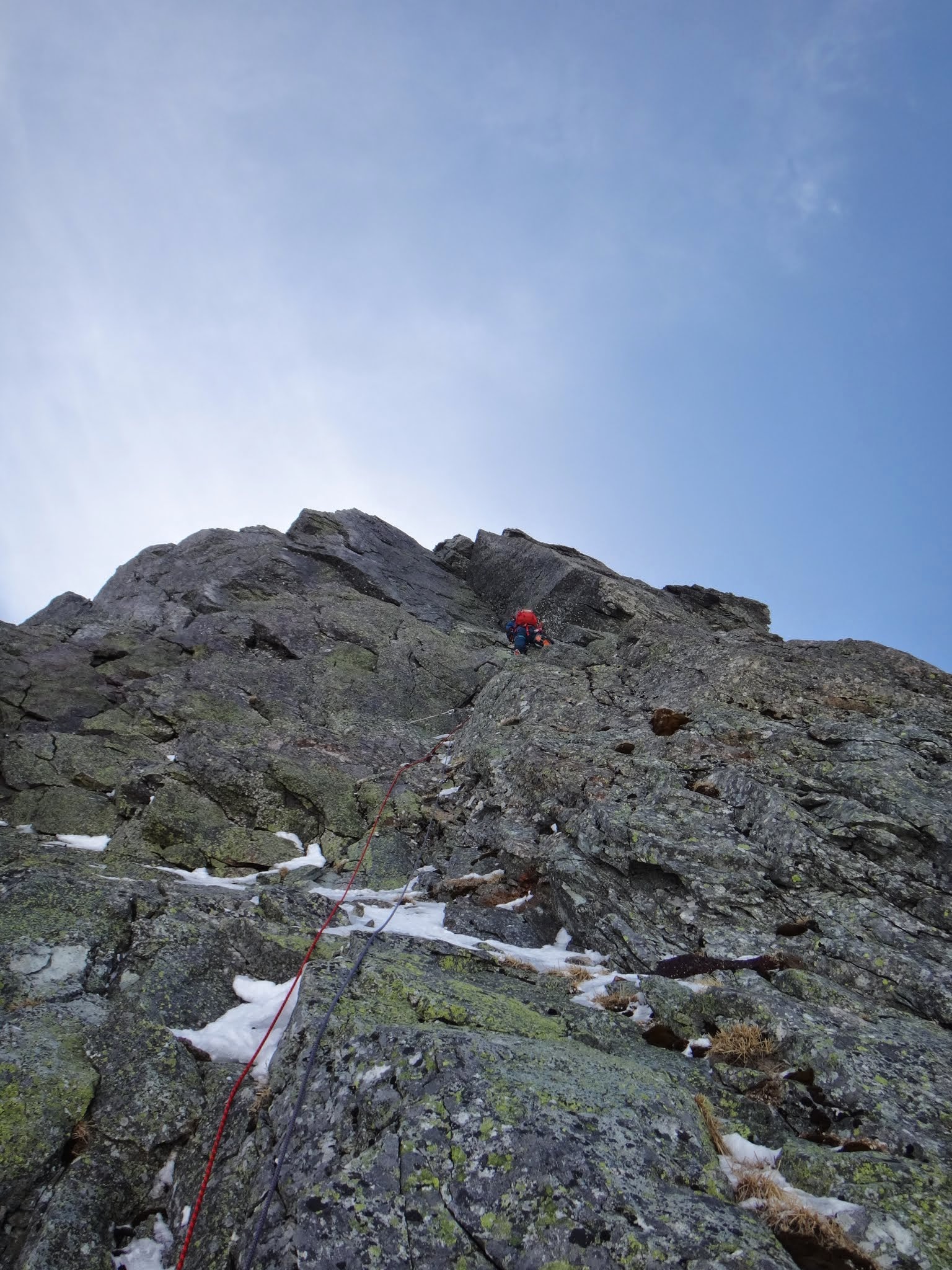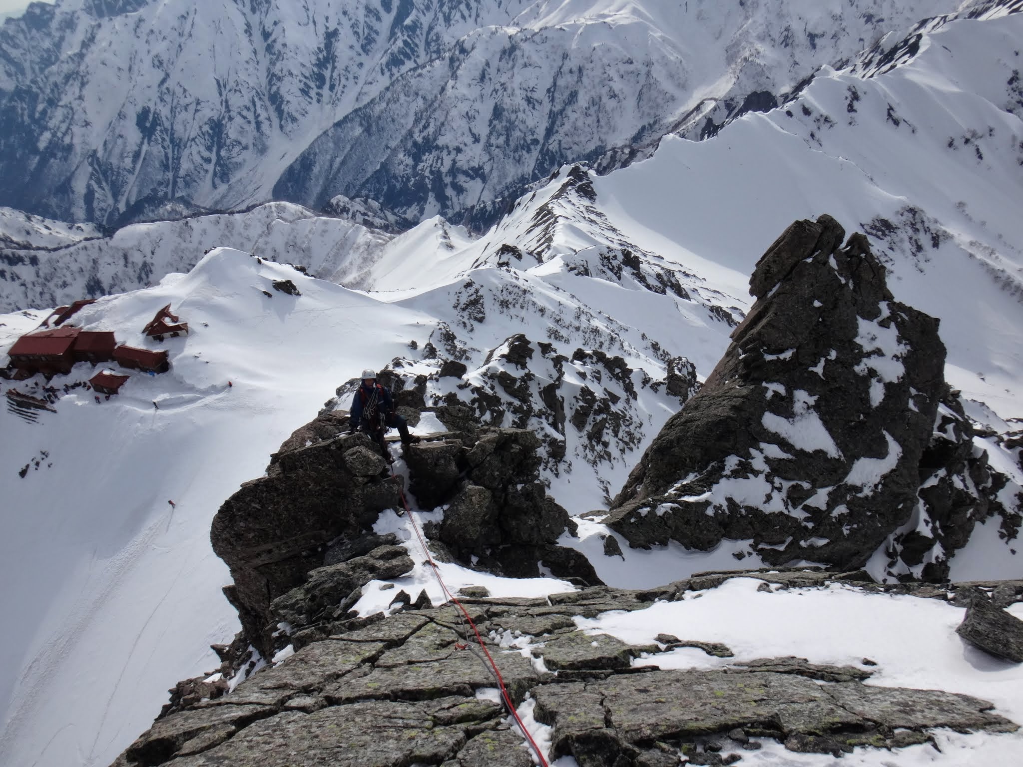 西稜への取り付きはいちばん雪の付いた斜面に取り付いた。一応、取り付く前にその地点からさらに200mくらい下まで下って、西稜に這い上がる地点を確認した。取り付きから3Pで大テラスに着いた。それから、