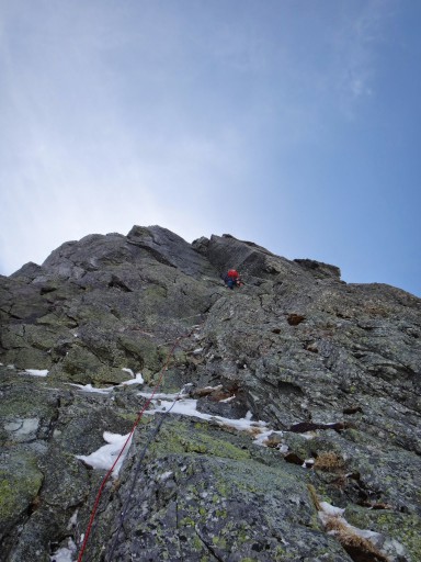 10p目40m(A)稜を一旦下降して、山頂に伸びている稜に移る。途中、リッジを登る箇所でとても嫌な所がある。アイゼンの爪を置く場所がなくて、私はアックスを岩に引っかけて体を持ち上げた。