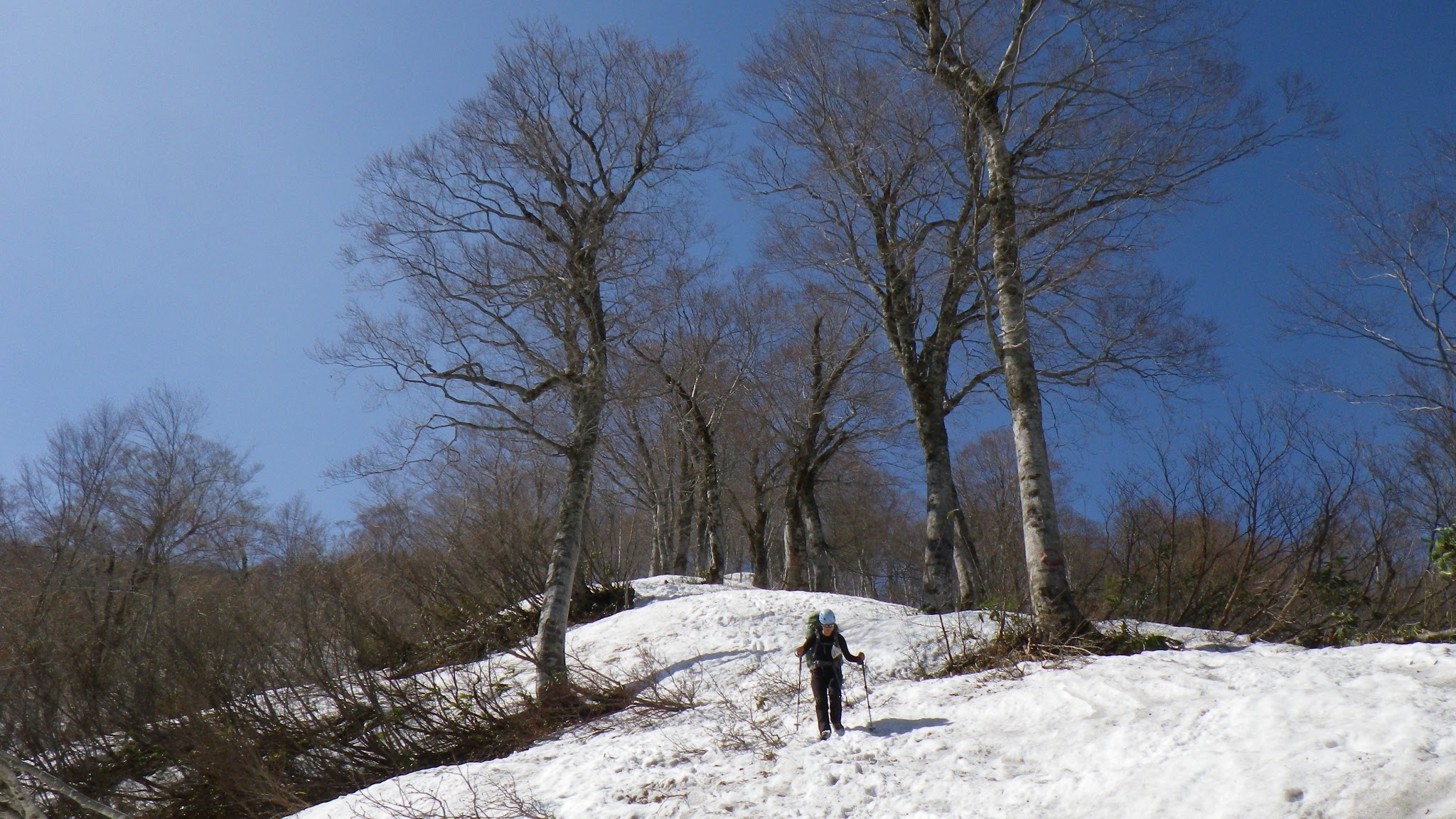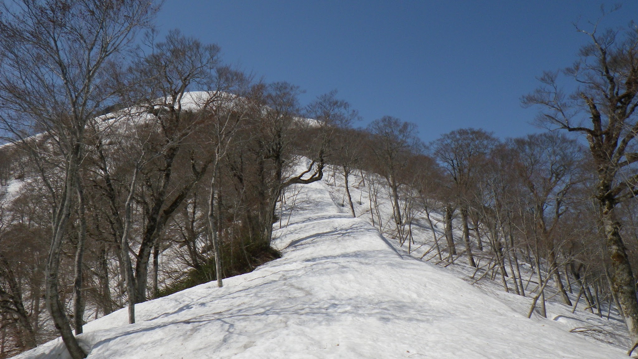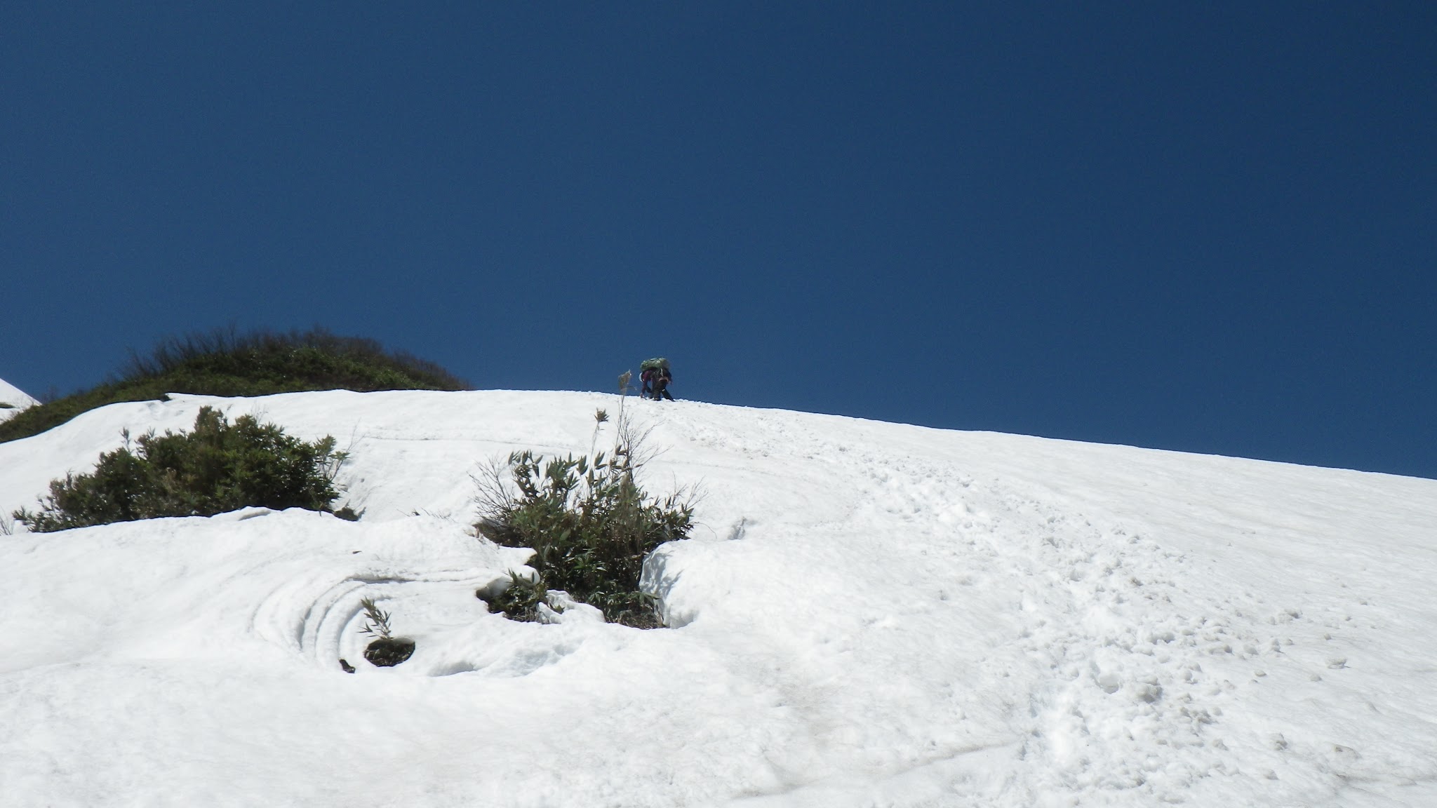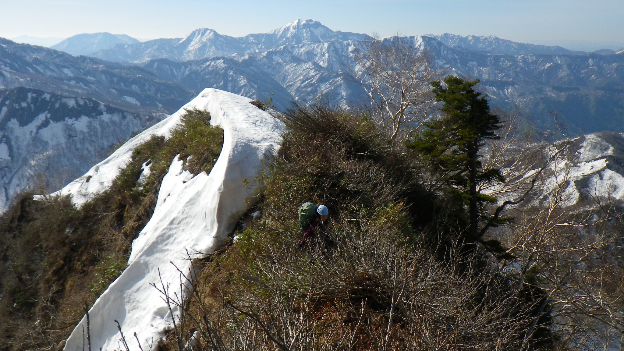 雪稜はすでにこの時期ヤブ稜だ。それもまた良し。