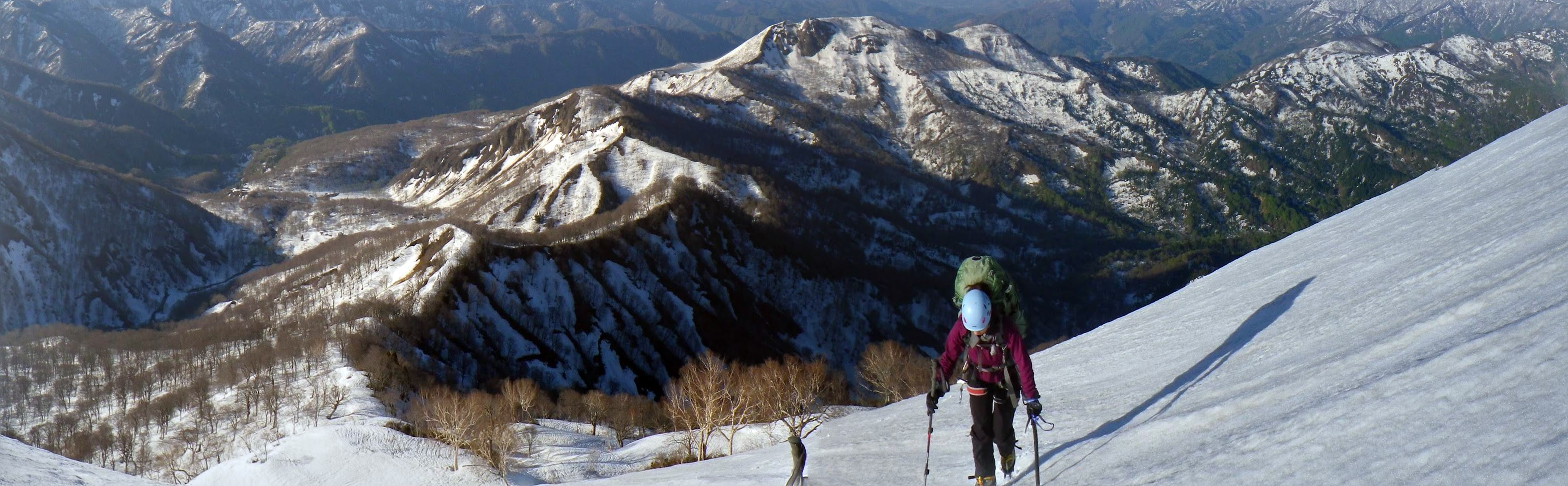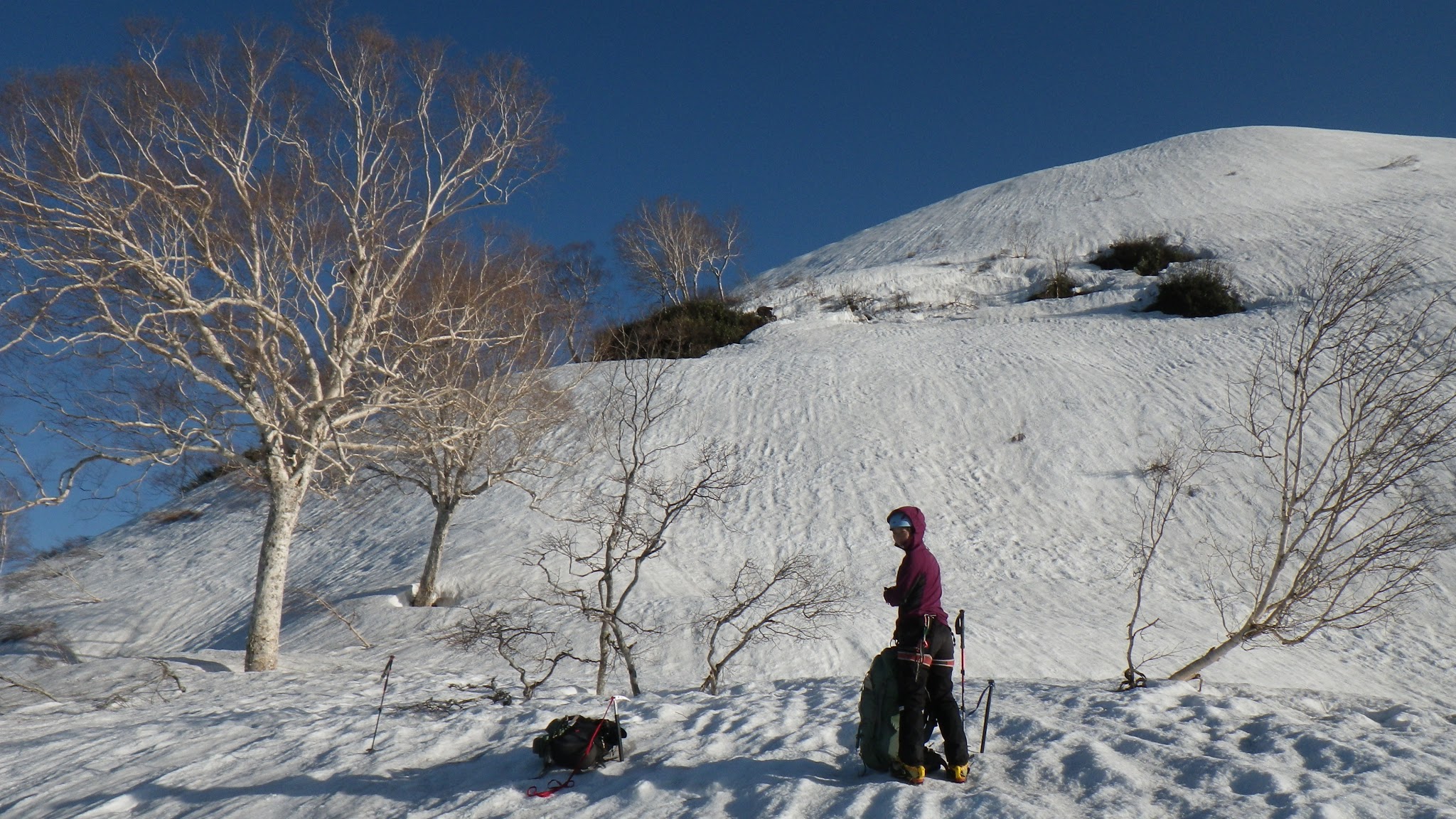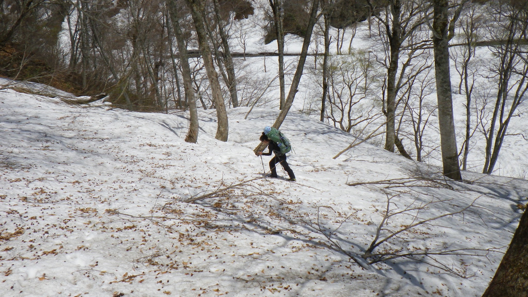 まだ雪山初心者のS木さん、バックステップで慎重に降りる。